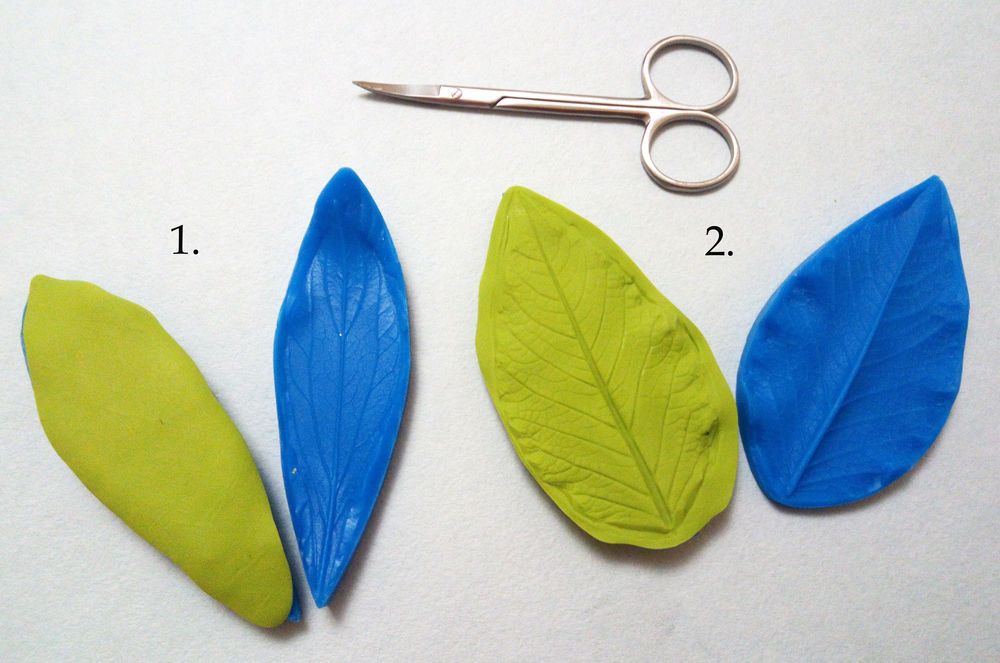- Потом сверху кладем вторую сторону молда, прижимаем тщательно, чтоб пропечатались все прожилочки, но не слишком сильно (со временем Вы поймете с какой силой нужно нажимать). Кстати, если центральная прожилка рвет глину, ее можно аккуратно срезать ножничкам. Получился отпечаток , на котором очень хорошо видно край листа (на фото цифра2):