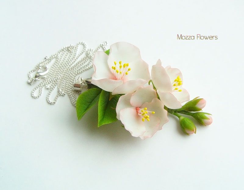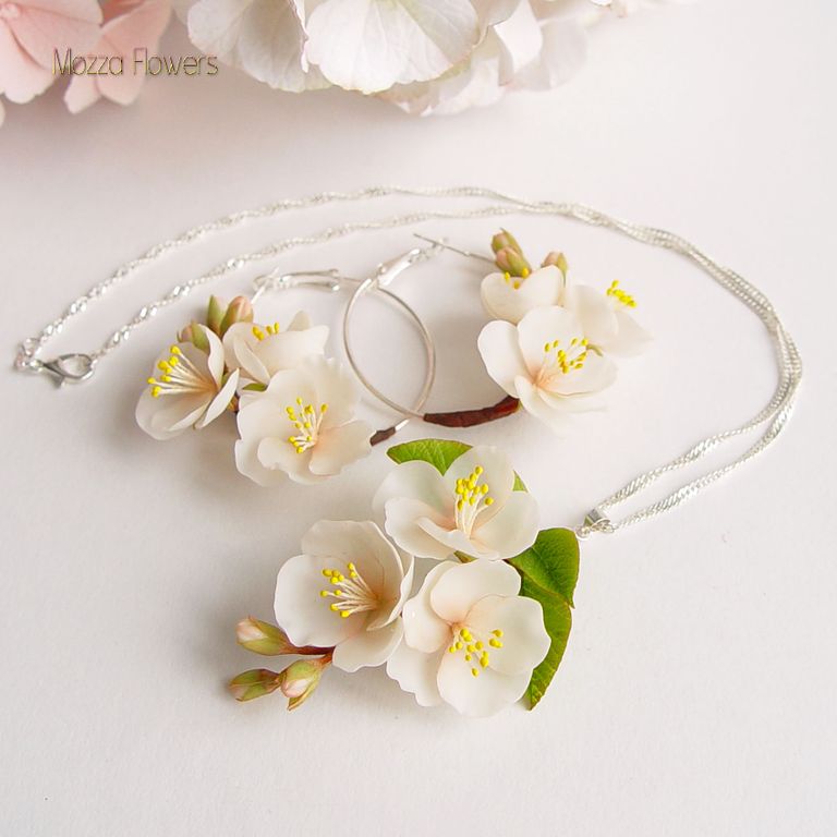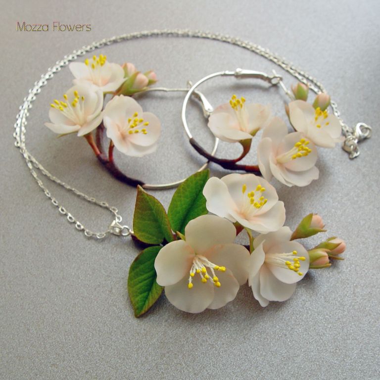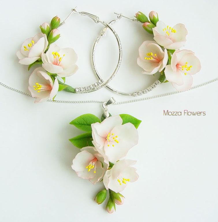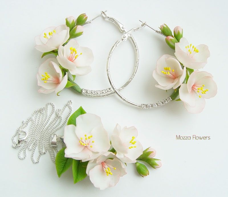 Комплект с цветами нежно-розовой яблони выполнен полностью вручную из полимерной глины (холодный фарфор) и тонирован масляными красками.