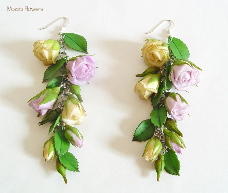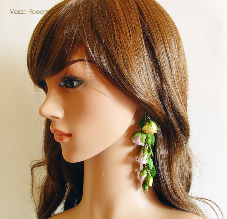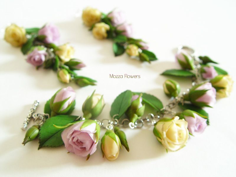 Нежный, чувственный, винтажный, с осенней ноткой, комплект из сиреневых и бежевых роз с листьями и бутонами, выполнен изполимерной глины и тонирован масляными красками полностью вручную.