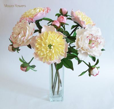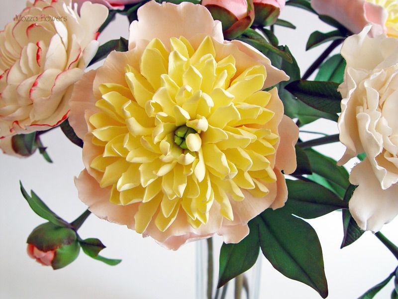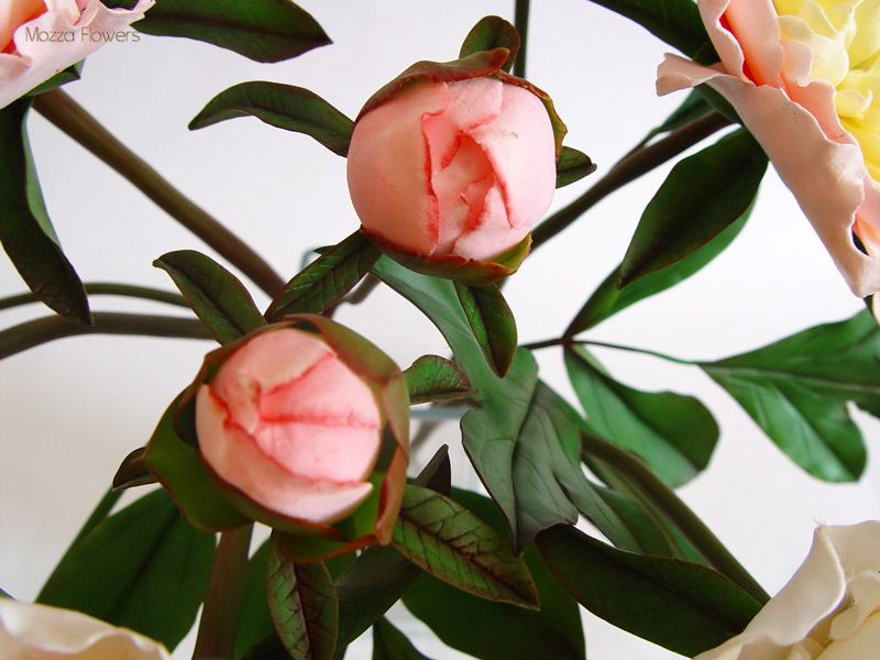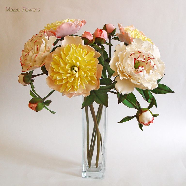 Букет выполнен полностью вручную из полимерных глин, слеплен лепесток за лепестком, листок за листком, а затем тонирован масляными красками.