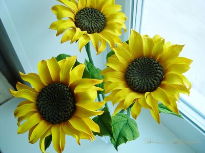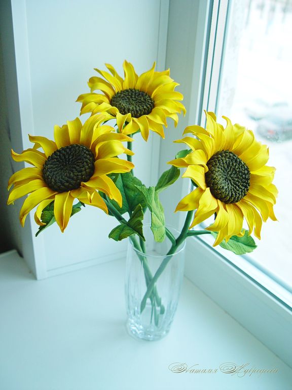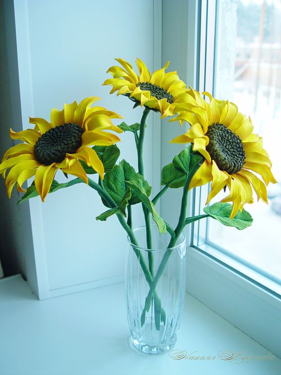 Букет "Поднолнухи" выполнен из полимерной глины и тонирован полностью вручную.