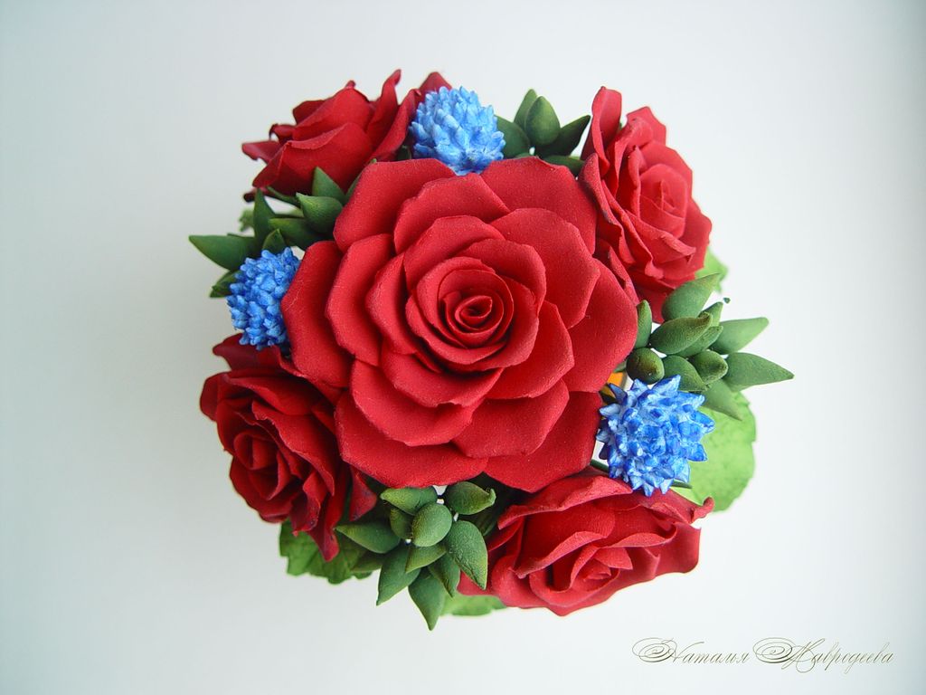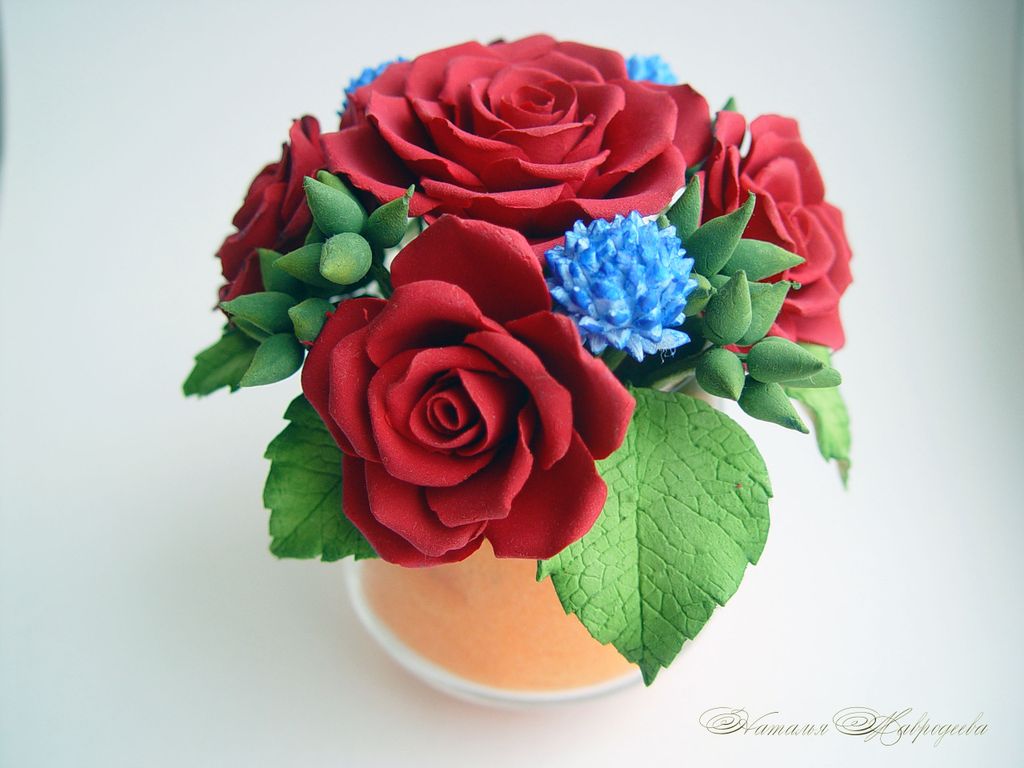 Букетик с красными розами выполнен полностью вручную из полимерной глины и тонирован маслом и акрилом.