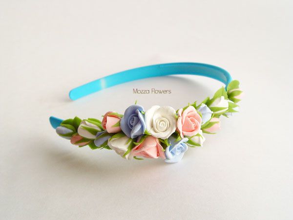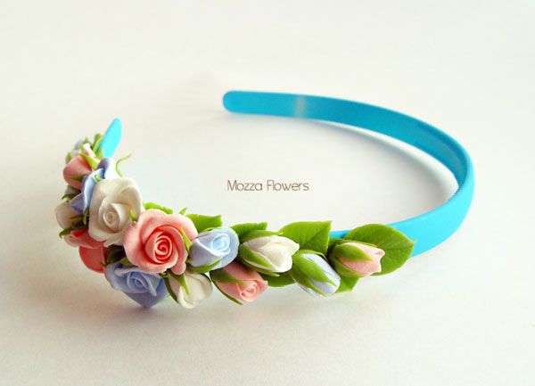 Ободочек с цветами из полимерной глины выполнен полностью вручную, слеплен лепесток за лепестком, листок за листком. В работе использовались 2 вида полимерной глины - бархатистая и обычная гладкая (холодный фарфор).