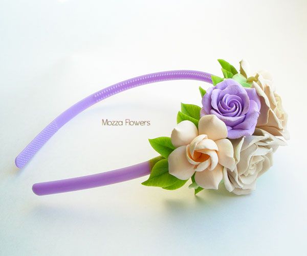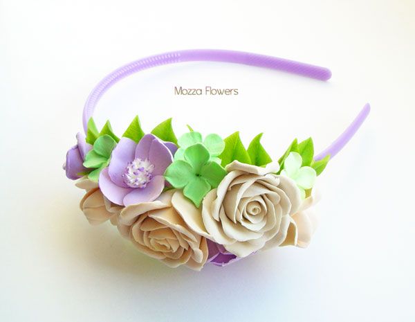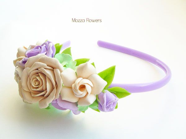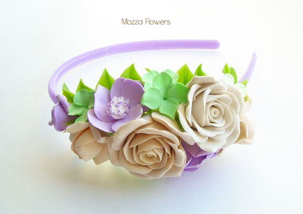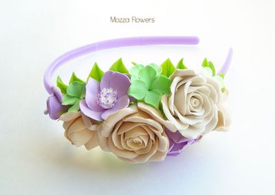 Ободок с цветами выполнен полностью вручную из двух видовполимерной глины - бархатной claycraft by deco и японского холодного фарфора. Листики тонированы маслом.