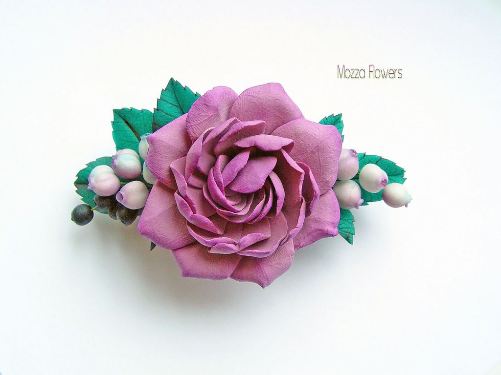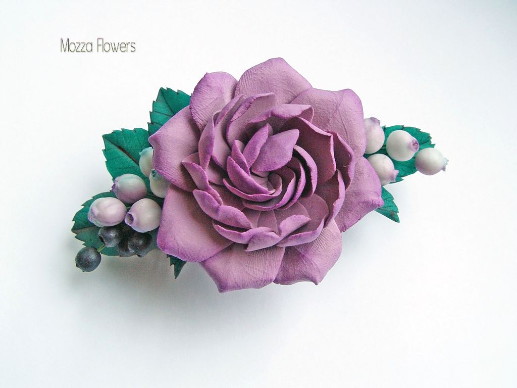 Заколка выполнена полностью вручную из полимерных глин. Цветоквыполнен из бархатной полимерной глины декоклей, черника, снежноягодник и листья выполнены из полимерной глины типа "холодный фарфор". тонированы масляными красками.