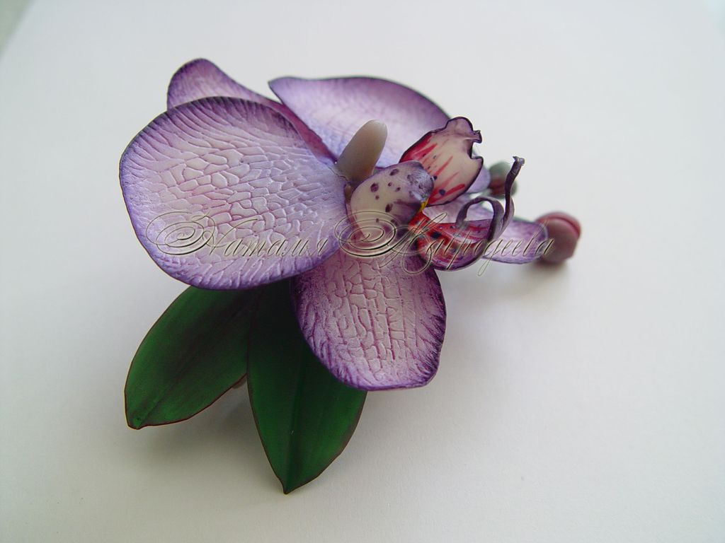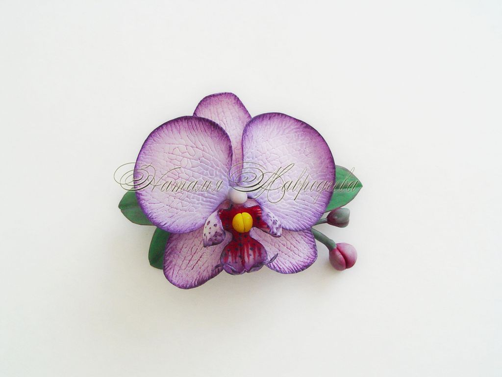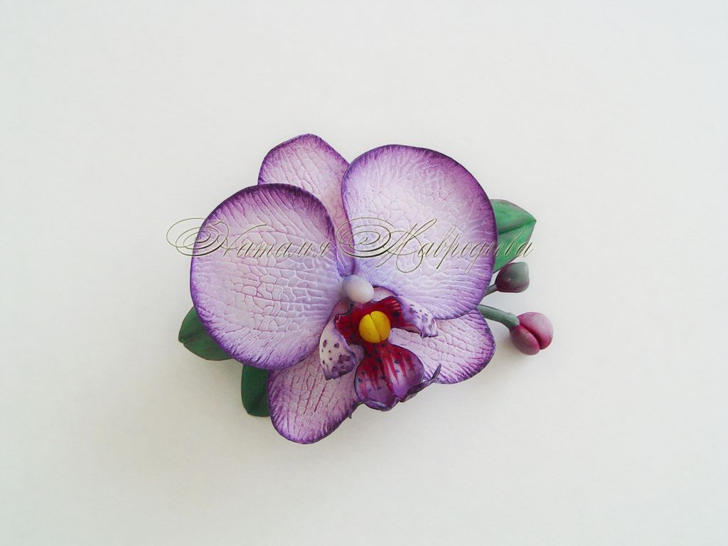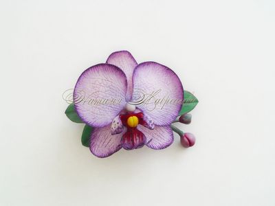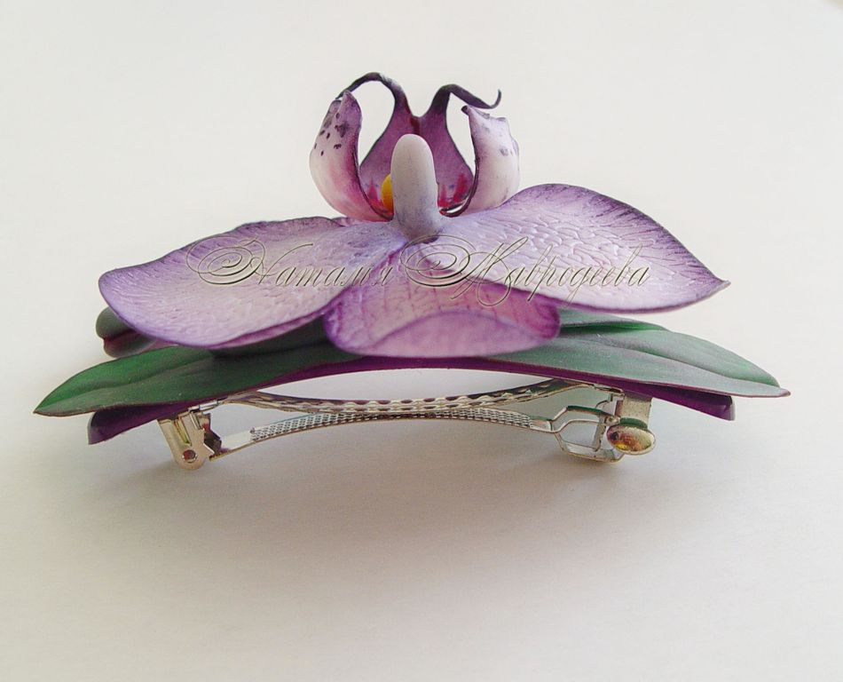 Заколка с орхидеей выполнена из полимерной глины и тонирована масляными красками полностью вручную.