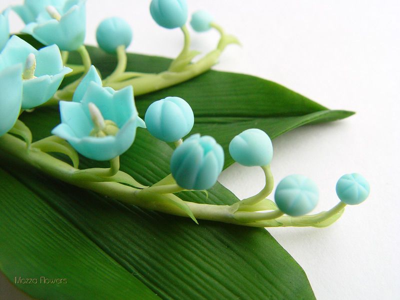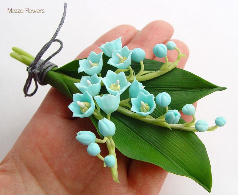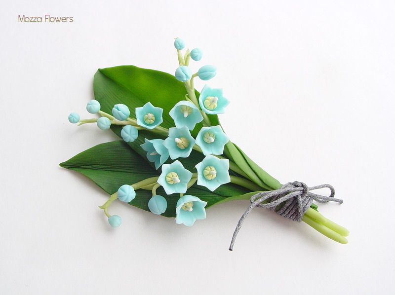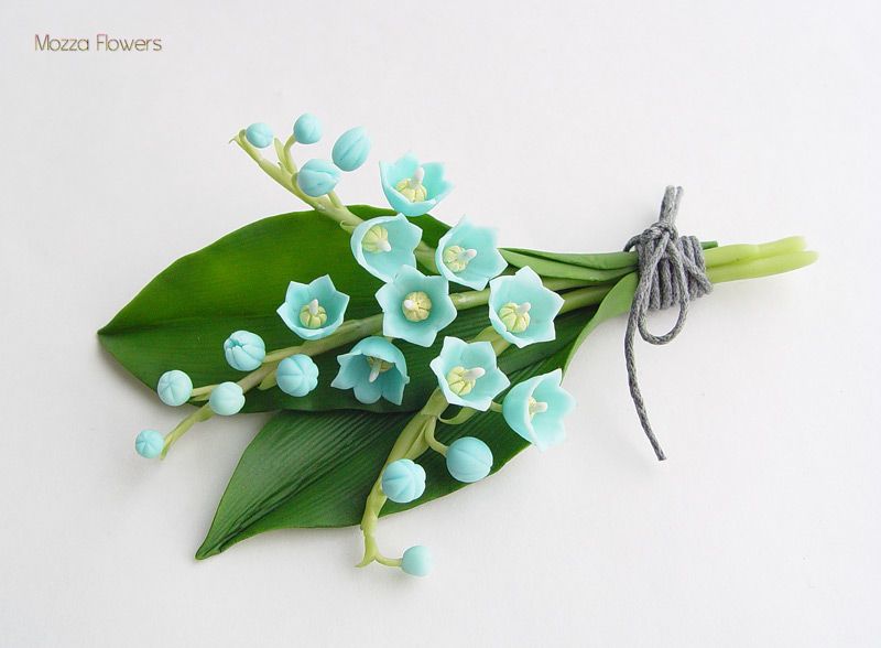 Ландыши выполнены из самоотвердеваемых полимерных глин и тонированы масляными красками полностью вручную.