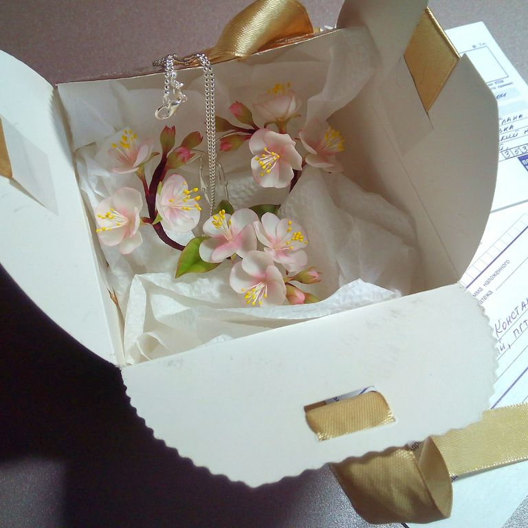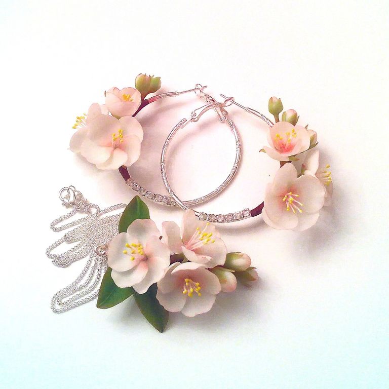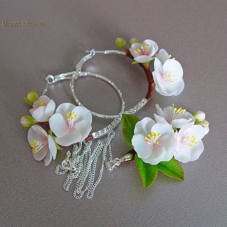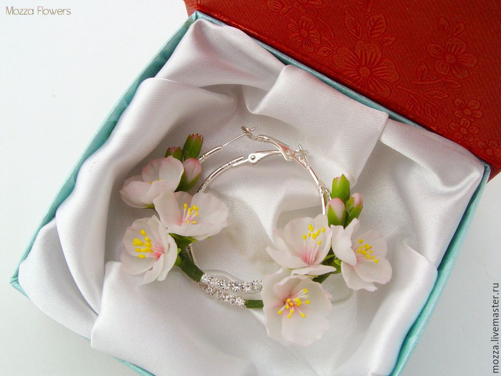 Серьги с цветами нежно-розовой яблони выполнены из полмиерной глины и тонированы масляными красками полностью вручную.