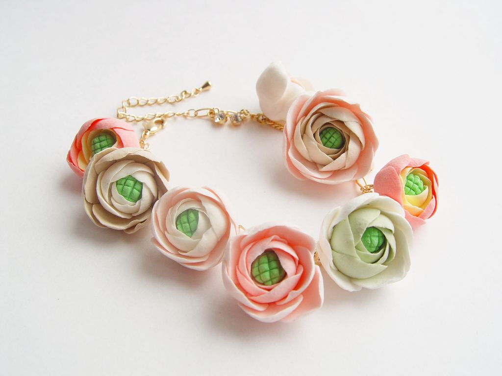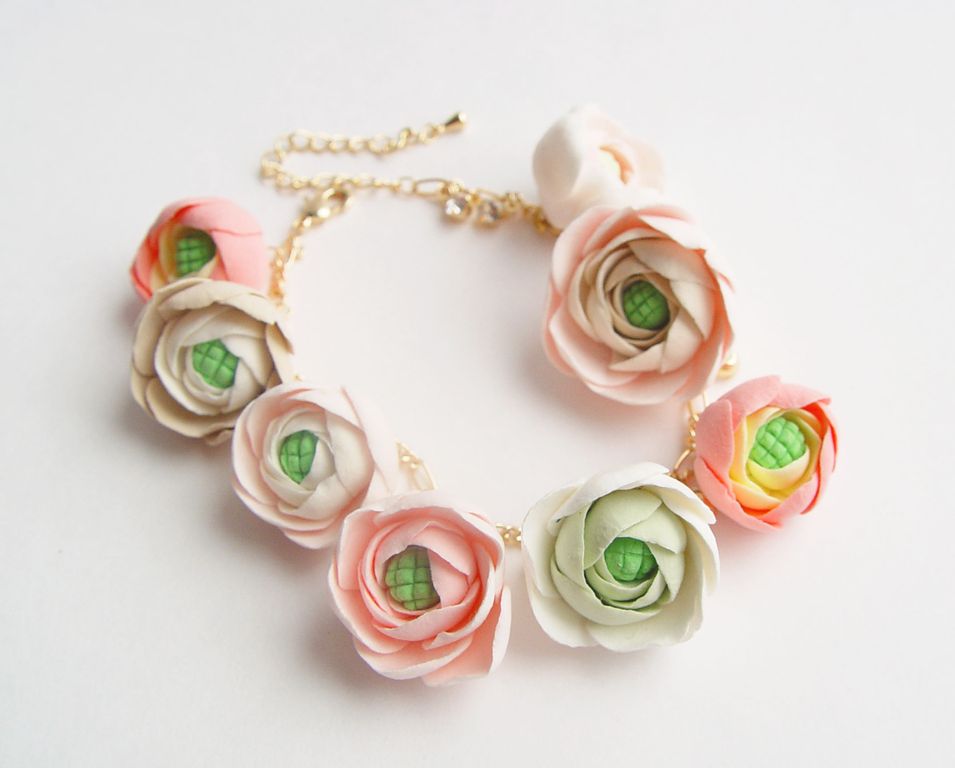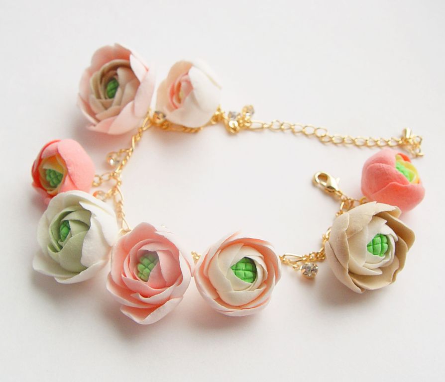 Цветы слеплены полностью вручную из самоотвердеваемой глины. Основа браслета позолоченнная (gold filled)