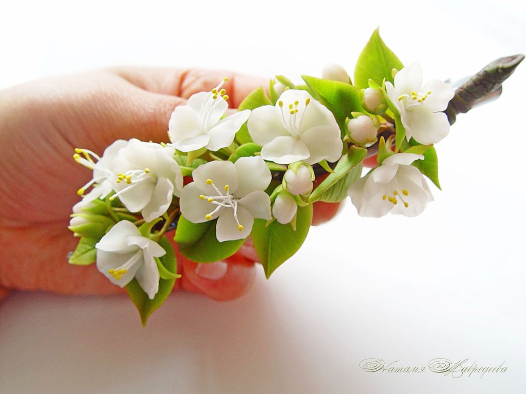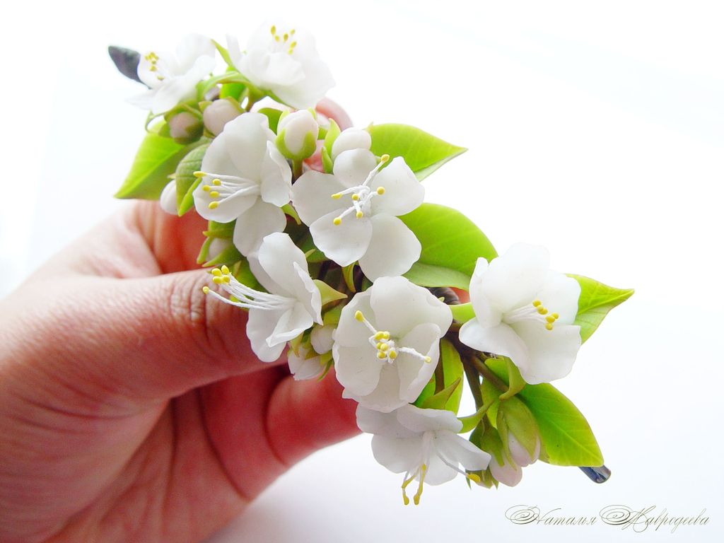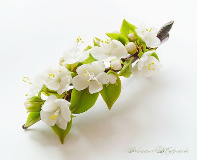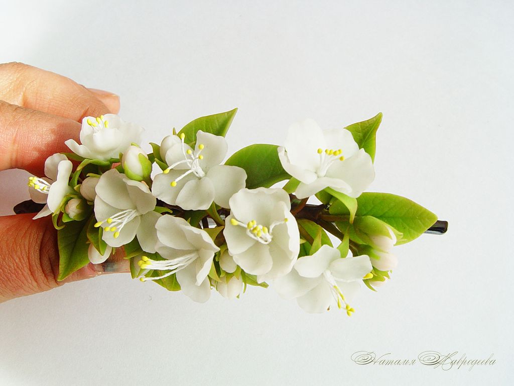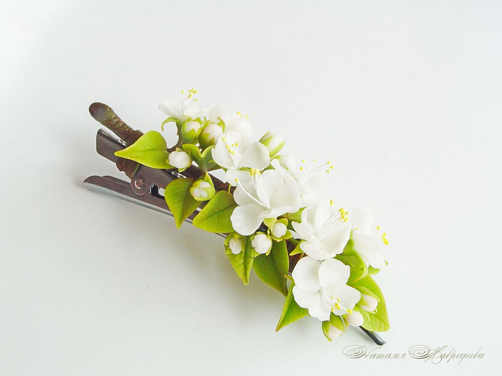 Зажим выполнен вручную из полимерной глины, слеплен лепесток за лепестком, листик за листиком и тонирован масляными красками.