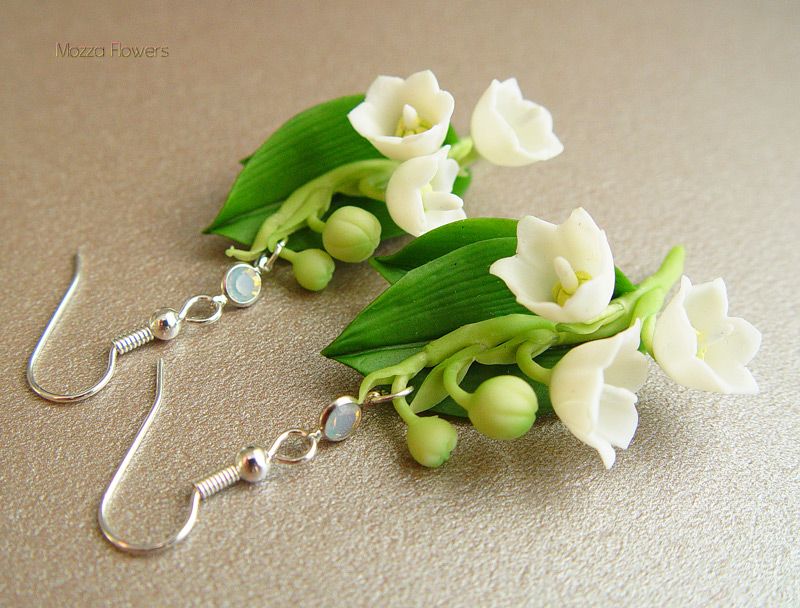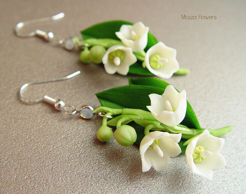 Прелестные сережки с белыми ландышами выполнены из полимерных глин и тонированы масляными красками полностью вручную.
