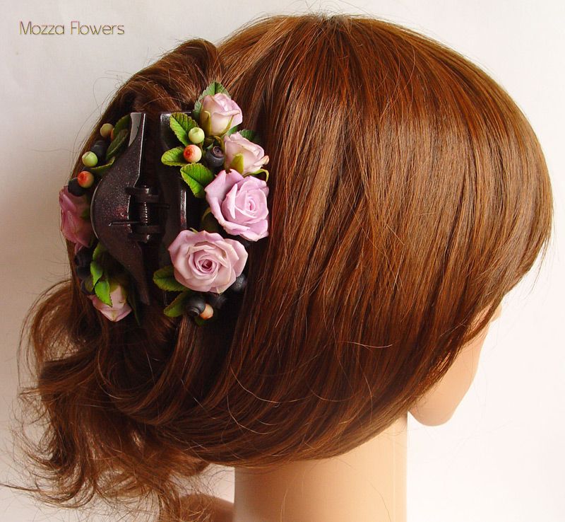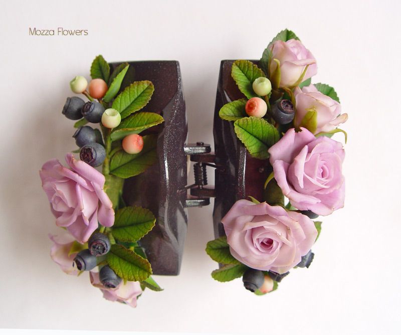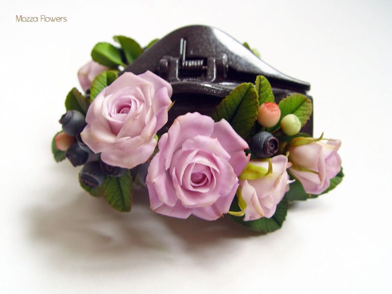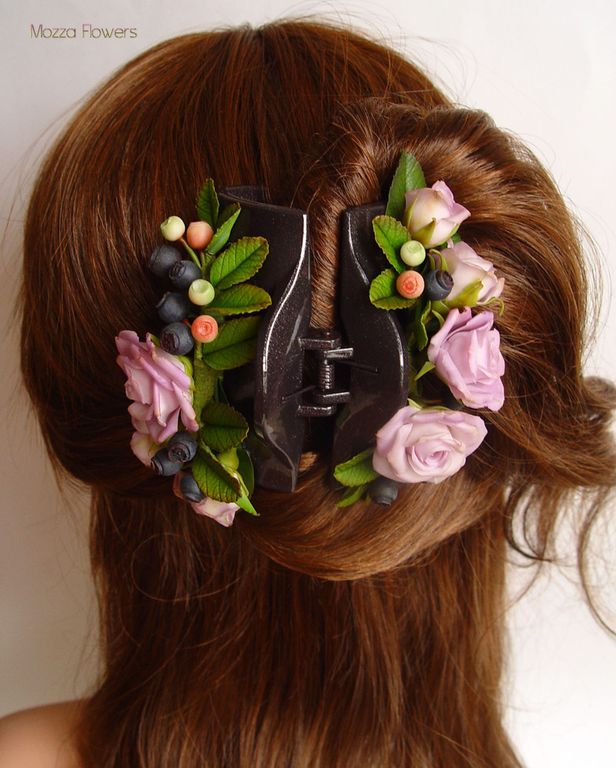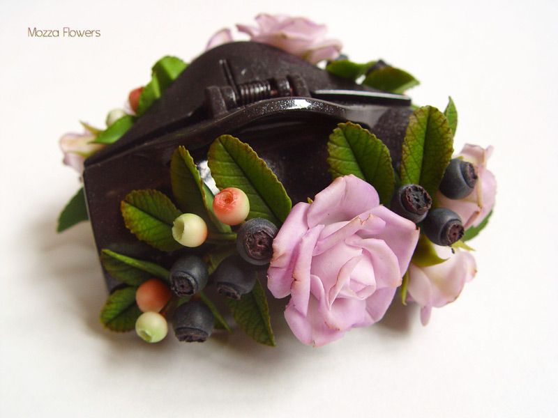 Краб для волос выполнен из нескольких видов полимернойсамоотвердеваемой глины и тонирован масляными красками полностью вручную.