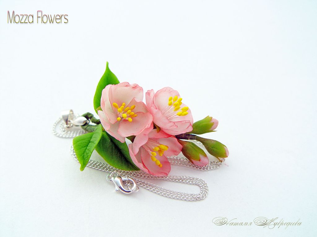 Кулон с цветами розовой яблони слеплен лепесток за лепестком из полимерной глины (холодный фарфор) и тонирован масляными красками полностью вручную.