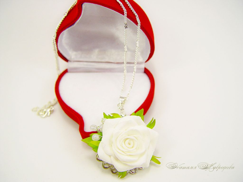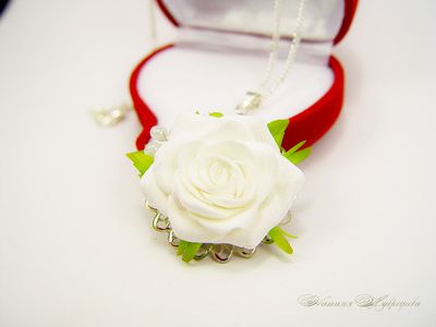 Кулон с белой бархатной розой выполнен полностью вручную из самоотвердевающих полимерных глин.