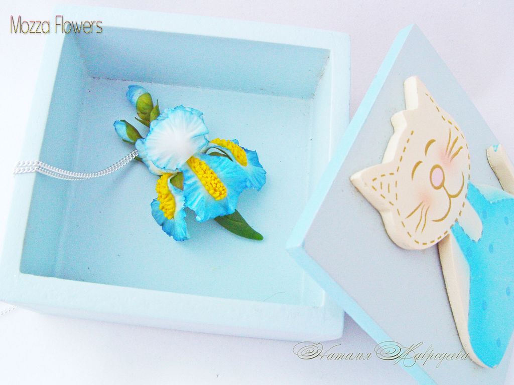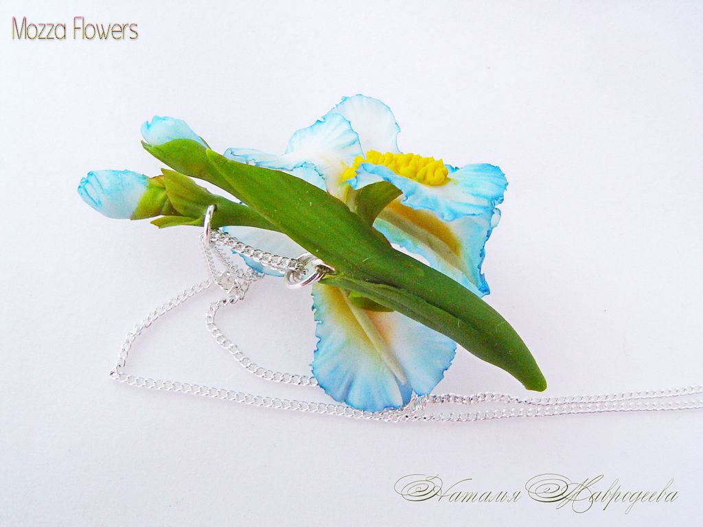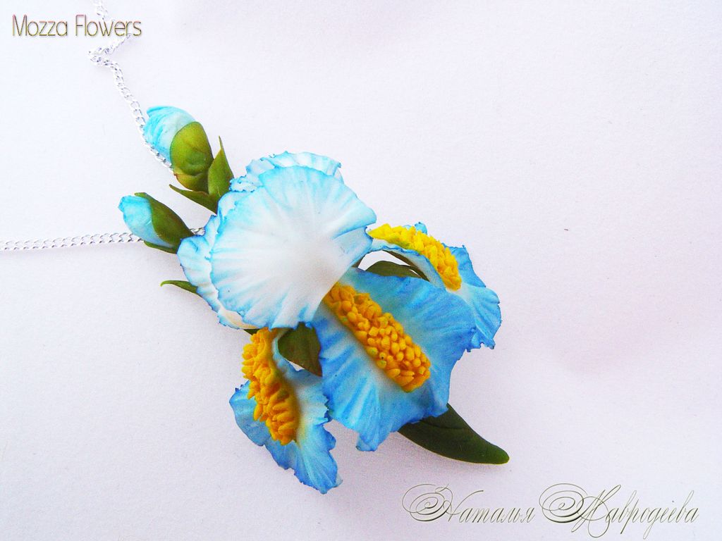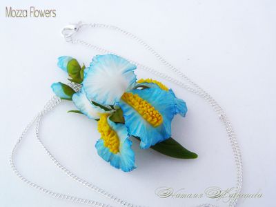 Кулон с голубым ирисом "Море грез" выполнен из самоотвердеваемой полимерной глины и тонирован масляными красками полностью вручную.