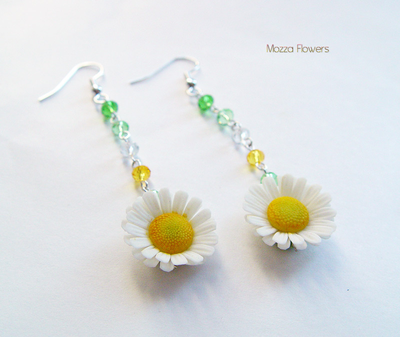 Длинные серьги с ромашками выполнены полностью вручную из полимерной глины.