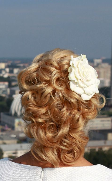 Крупный цветок розы будет очень красиво, стильно и модно смотреться всвадебной прическе.