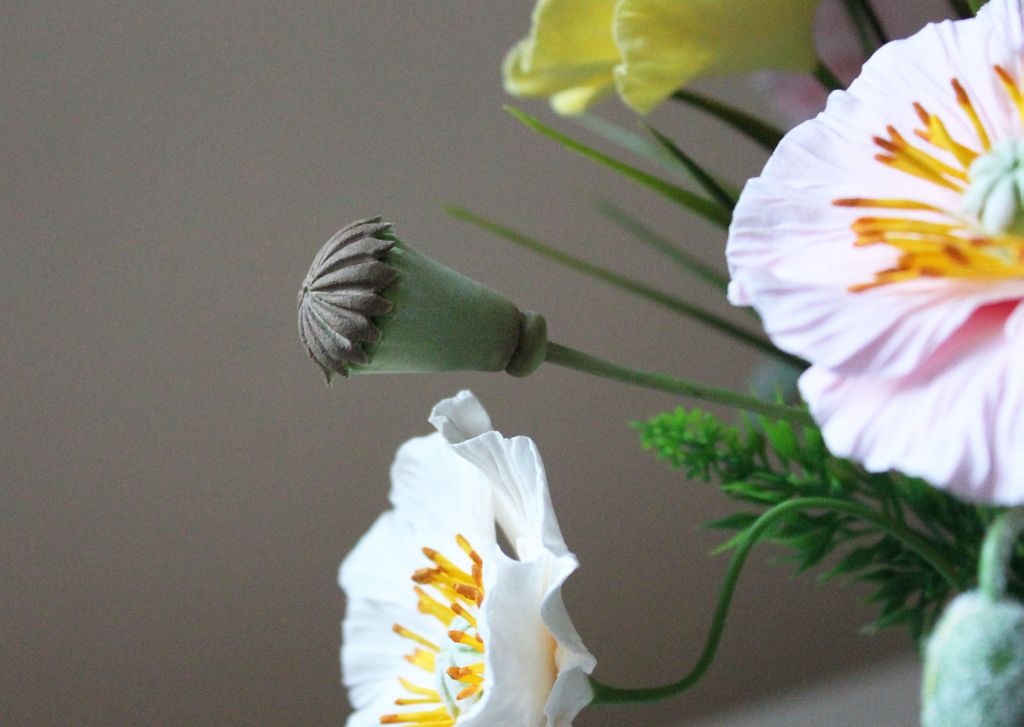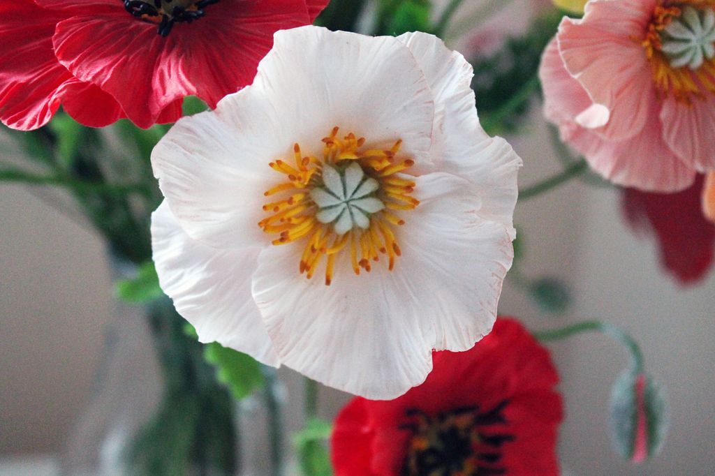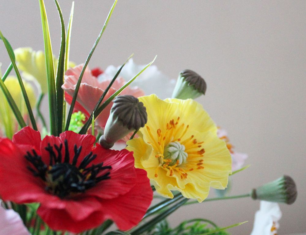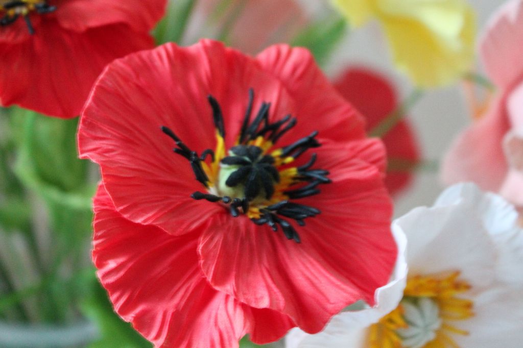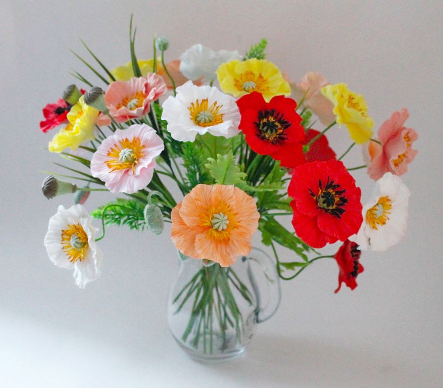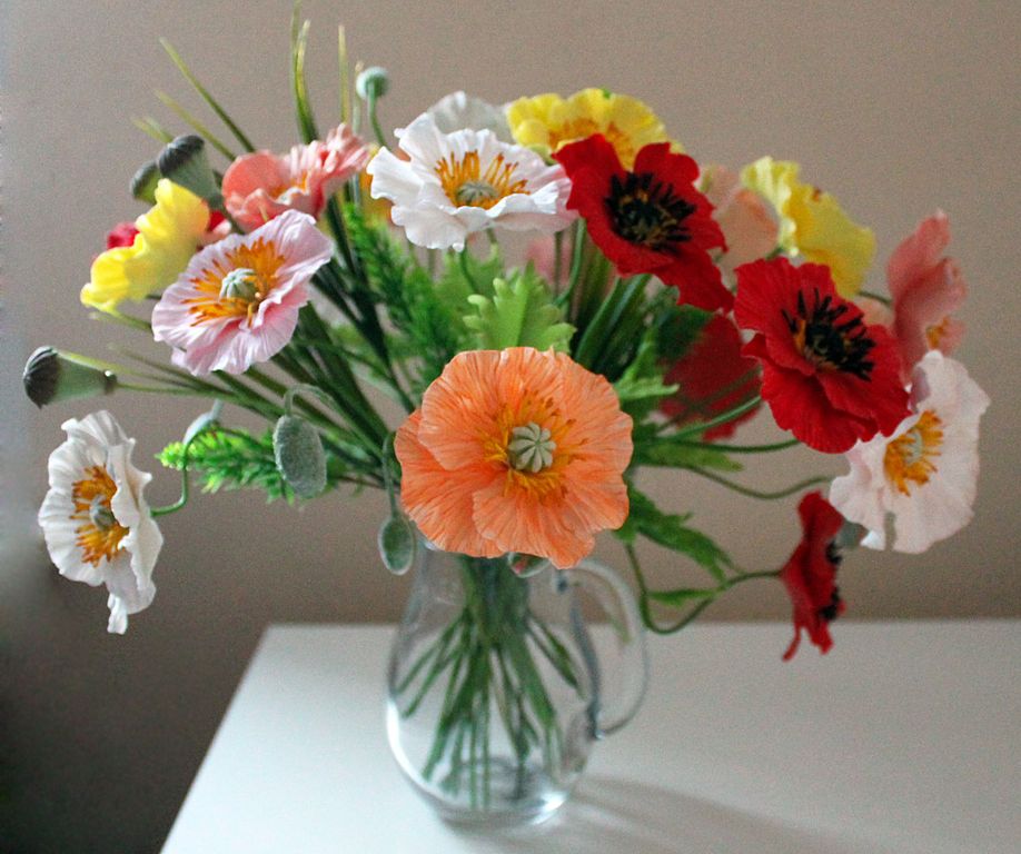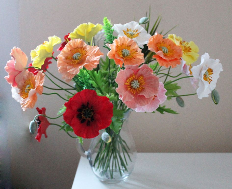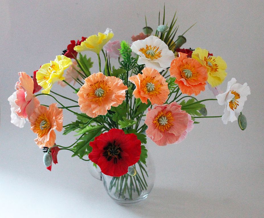 Состав букета: 5 красных, 5 белых, 5 оранжевых, 4 желтых, 3 нежно-розовых , 3 нежно-коралловых мака, 7 бутончиков, 3 маковых коробочки, много листиков , искусственная зелень.