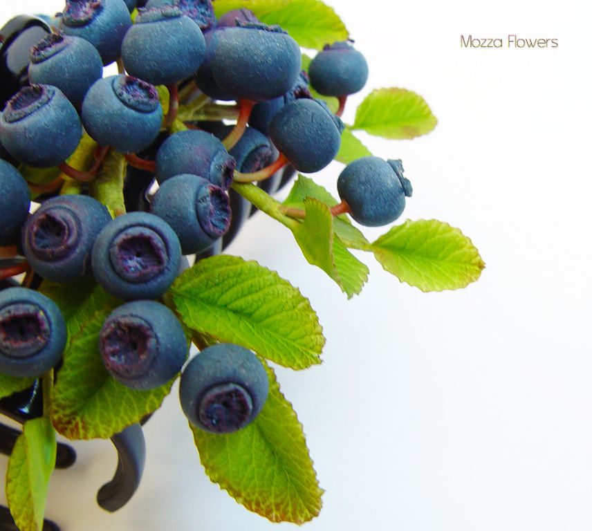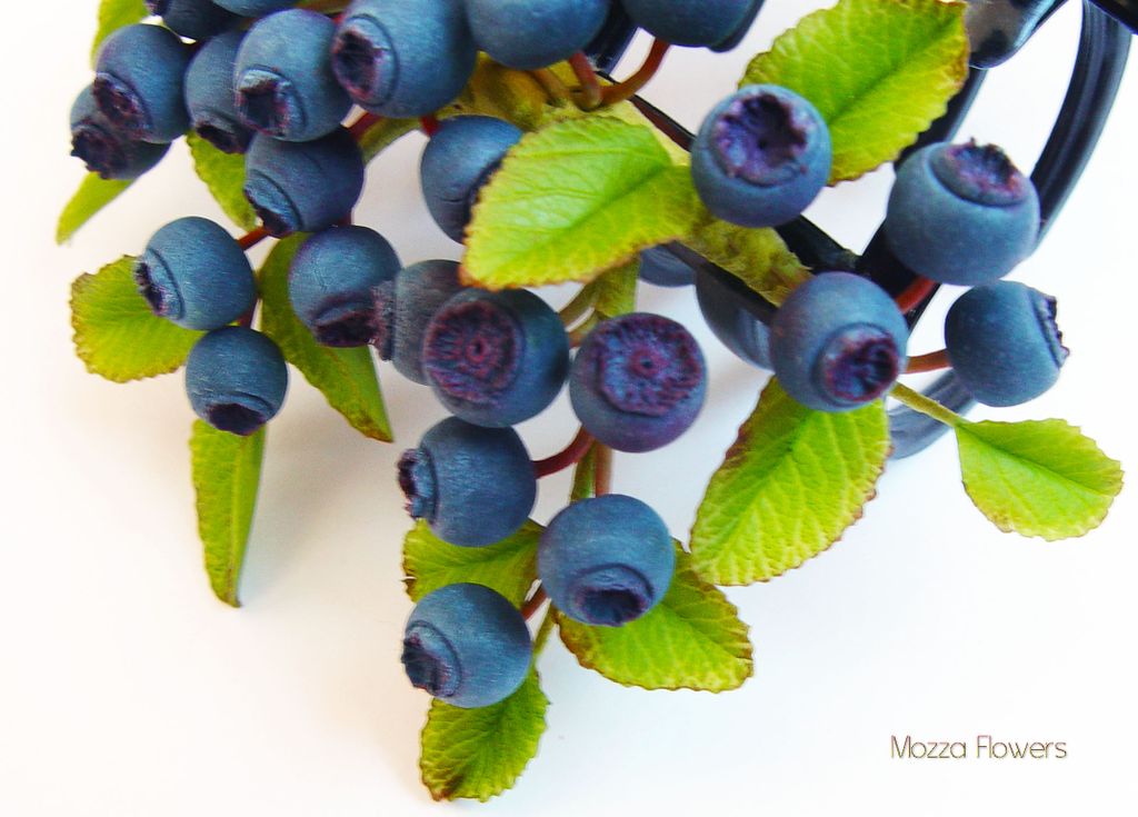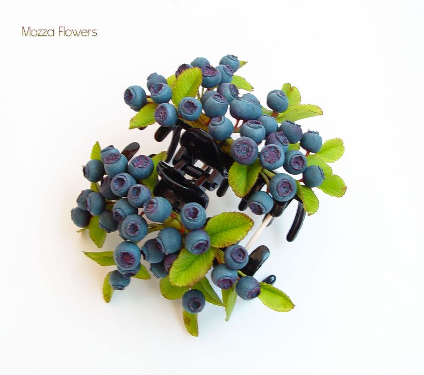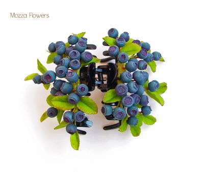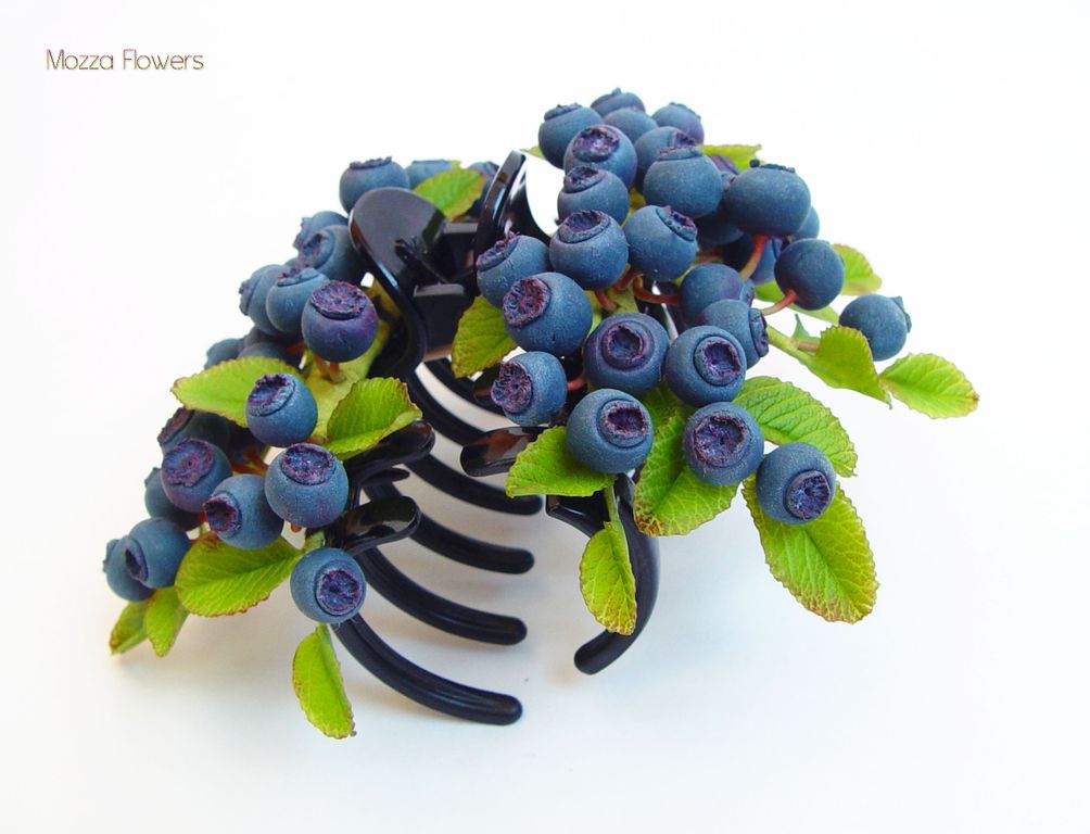 Целая черничная полянка обосновалась на этом украшении для волос. Глядя на него, возникает такое ощущение, что кто-то сорвал несколько живых веточек, усыпанных крупными ягодами черники, и закрепил их в прическе.