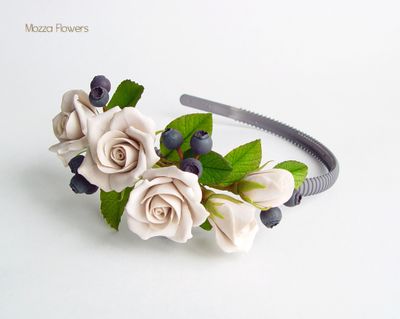 Ободок с черникой и с розами цвета "кофе с молоком" выполнен полностью вручную из самоотвердеваемой полимерной глины и тонирован масляными красками.