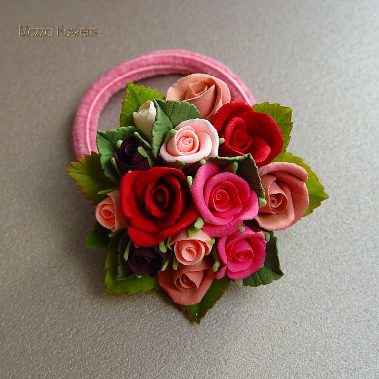 Резинка для волос с букетиком выполнена из полимерной глины полностью вручную.