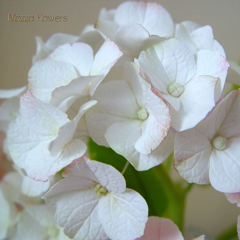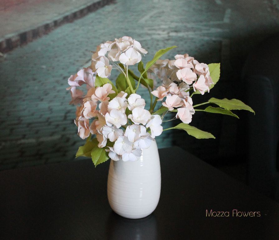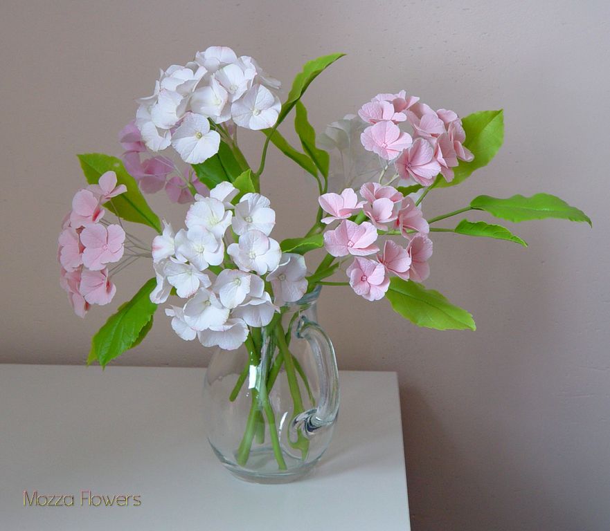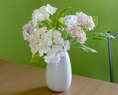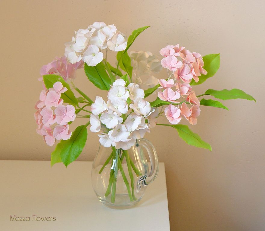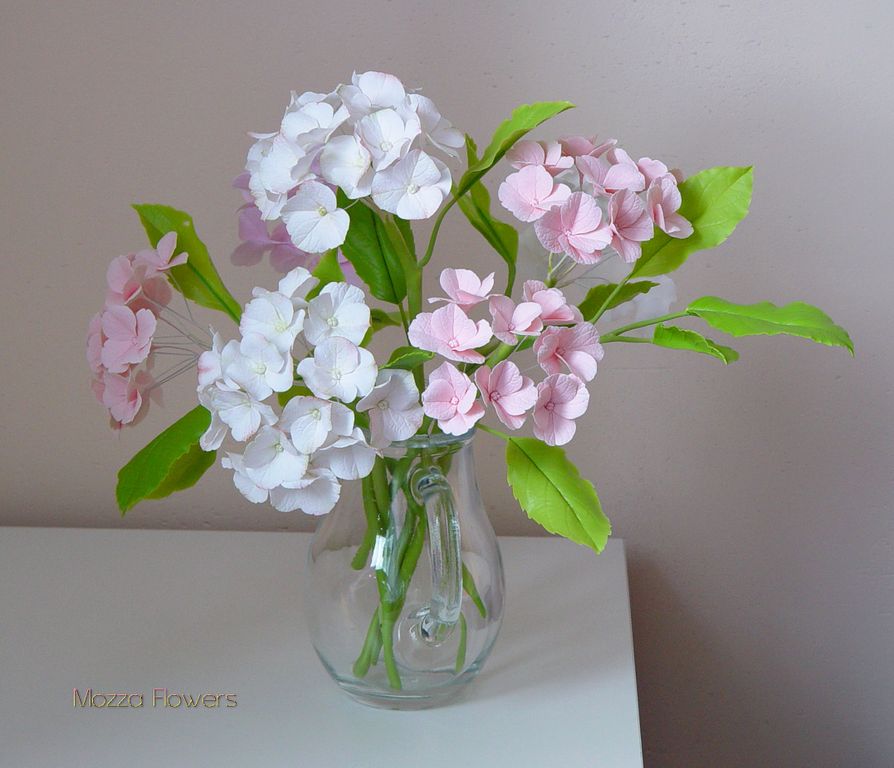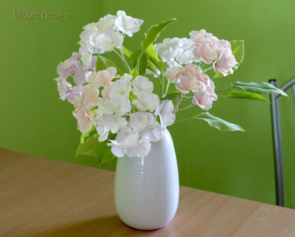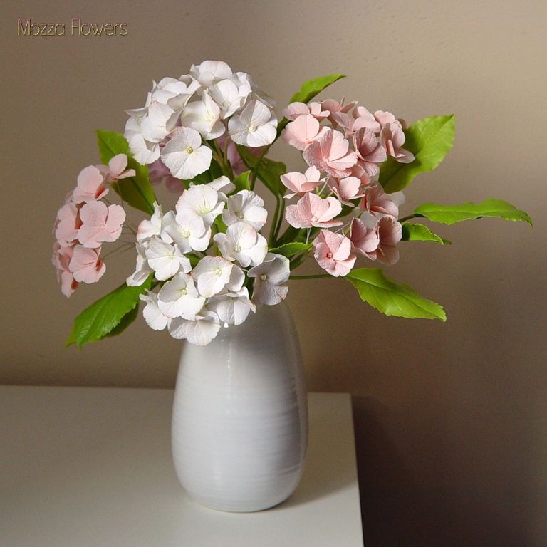Букет белых и розовых гортензий выполнен полностью вручную из самоотвердеваемых полимерных глин.