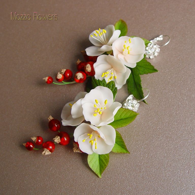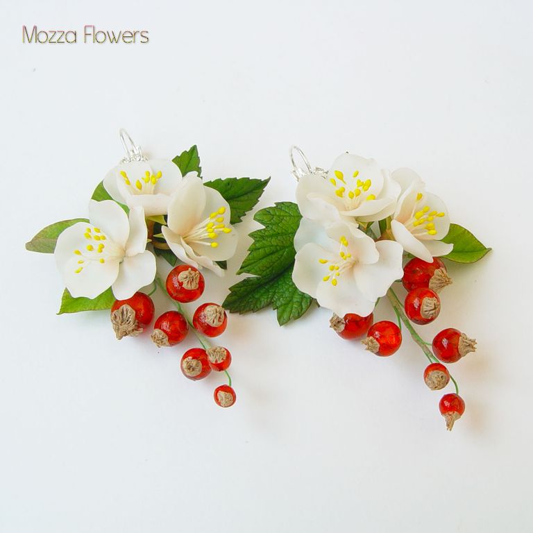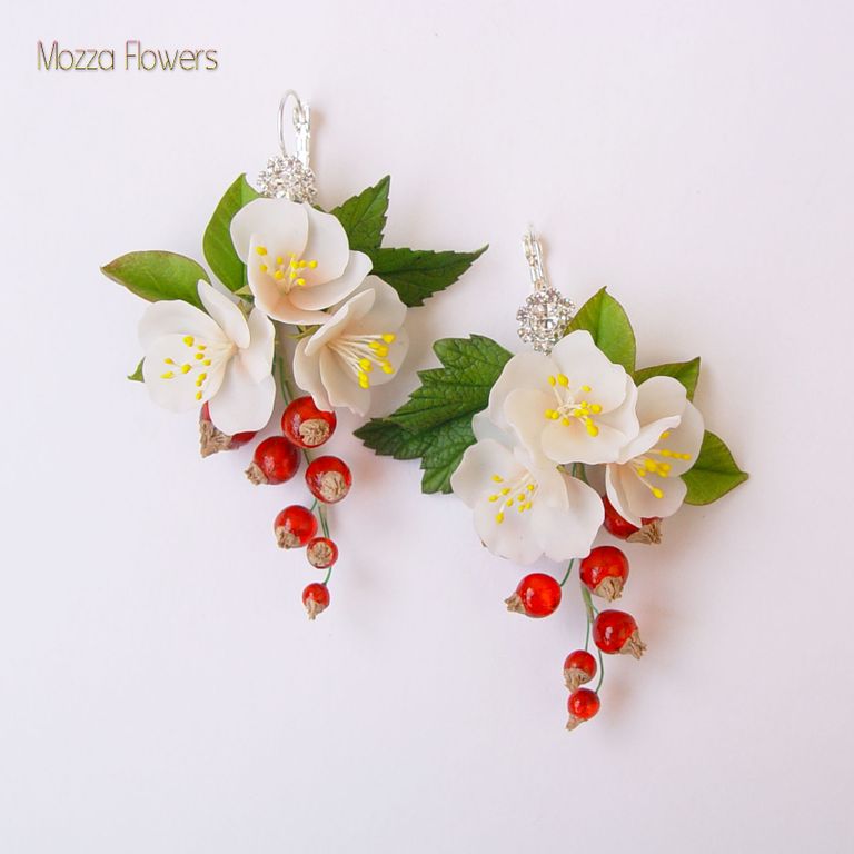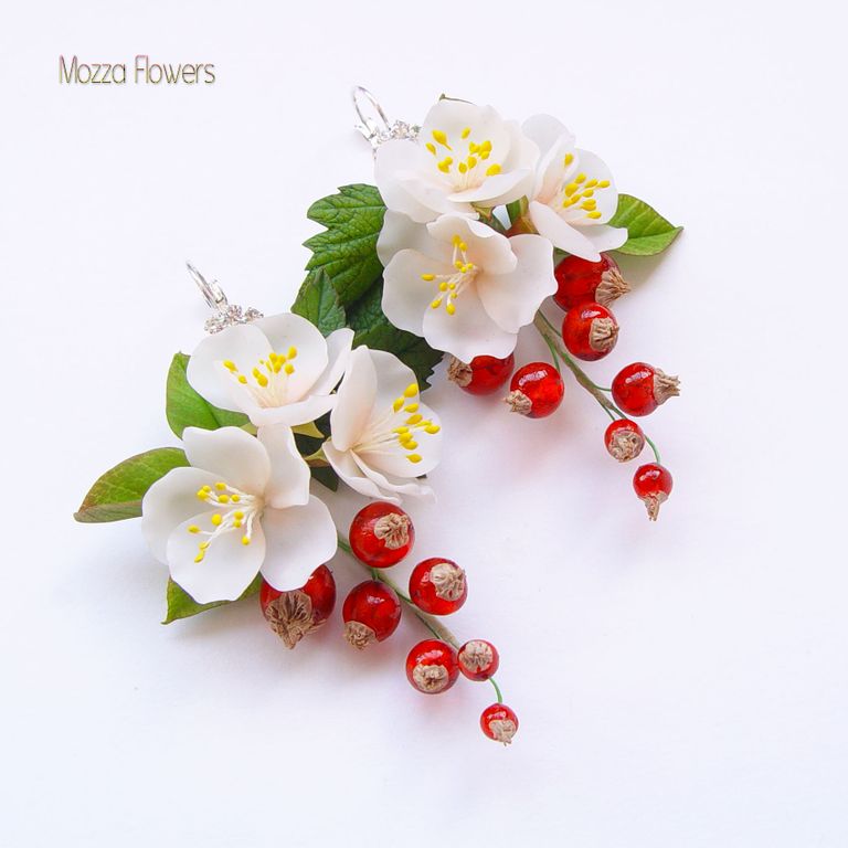 Серьги с цветами яблони и с ягодами красной смородины выполнены полностью вручную из полимерной глины и эпоксидной смолы.