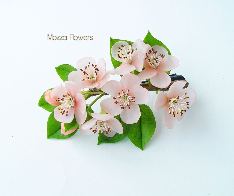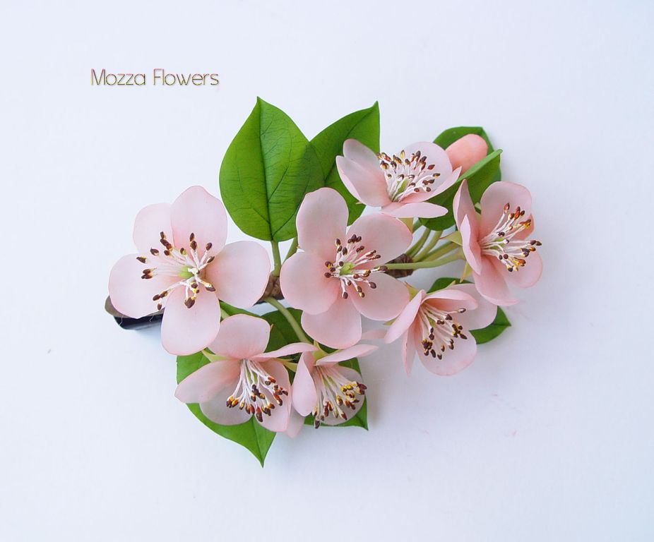 Зажим с веточкой розовой яблони выполнен полностью вручную из полимерной глины и тонирован масляными красками.