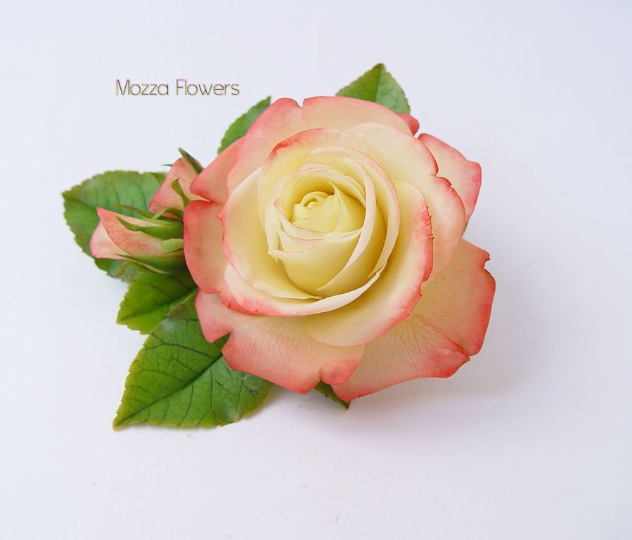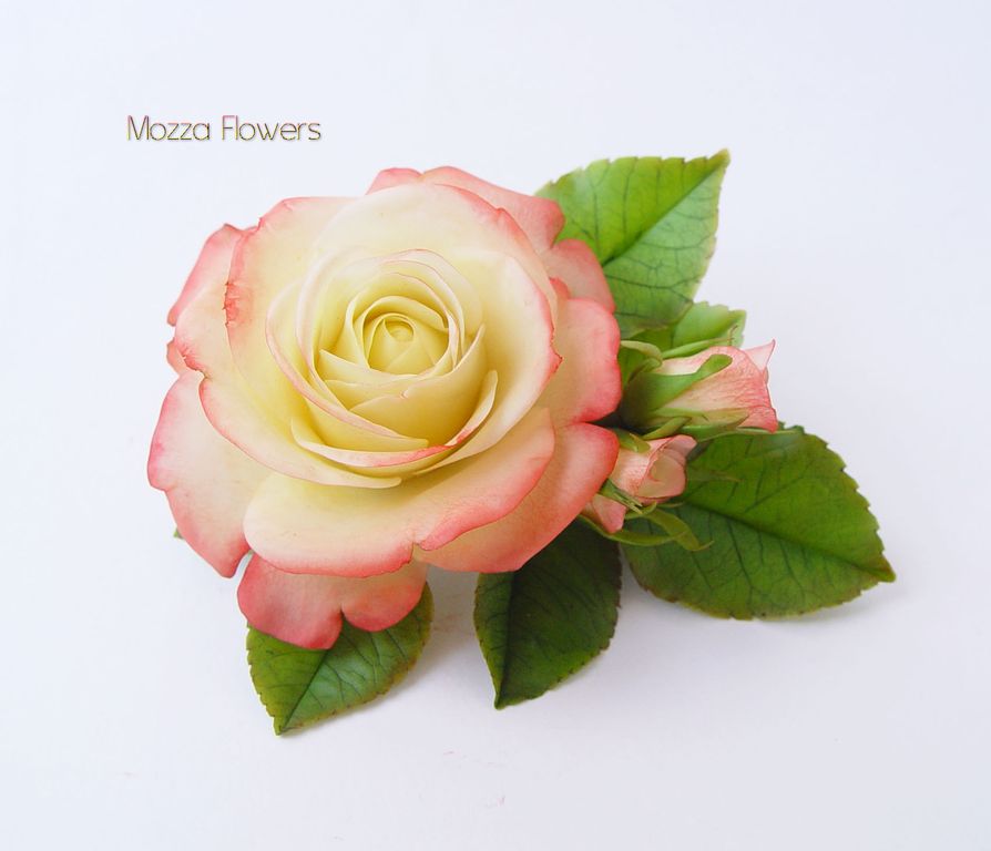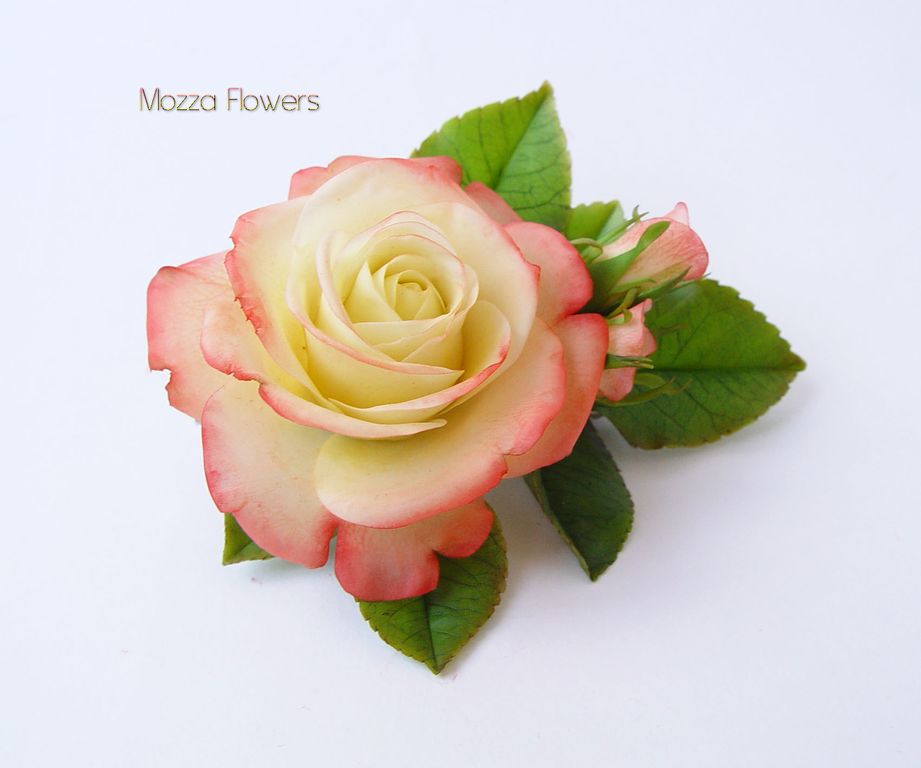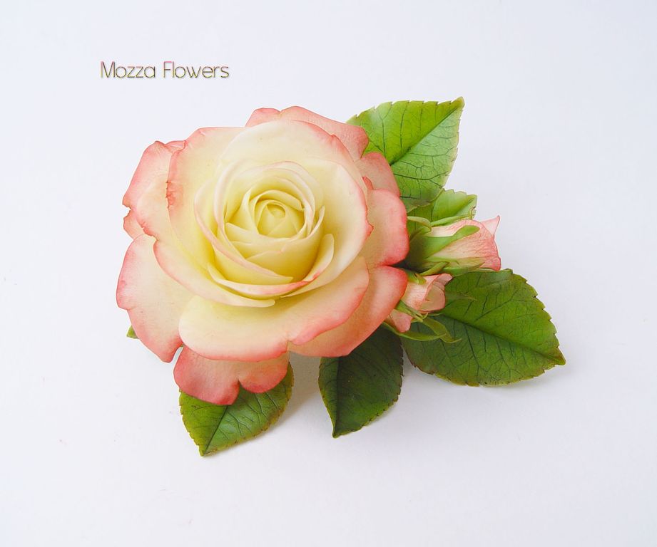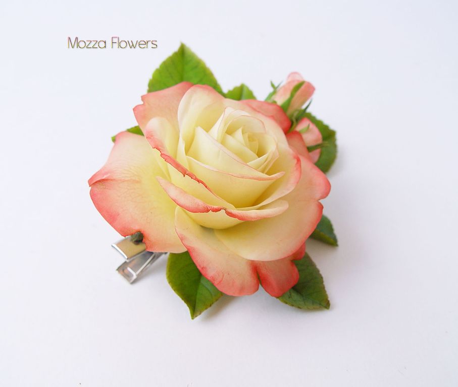 Зажим с розой "Gloria Day" выполнен полностью вручную из полимерной глины и тонирован масляными красками.