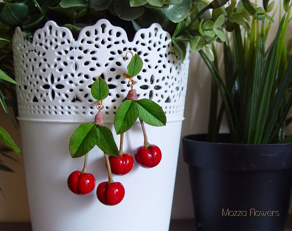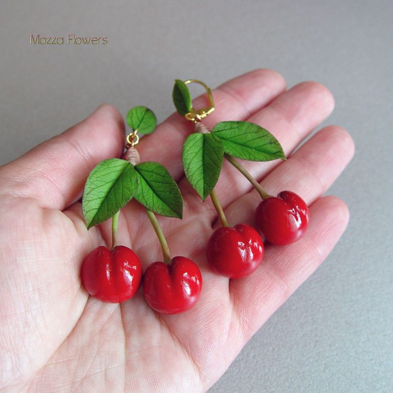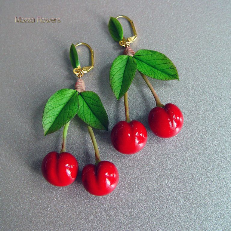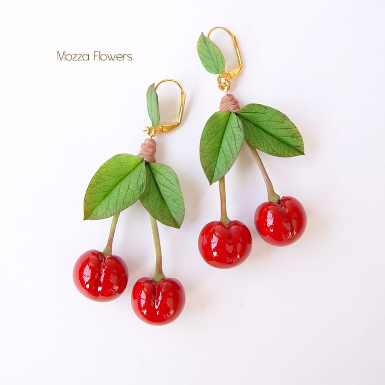 Серьги с вишней выполнены полностью вручную из полимерной глины и тонированы красками.