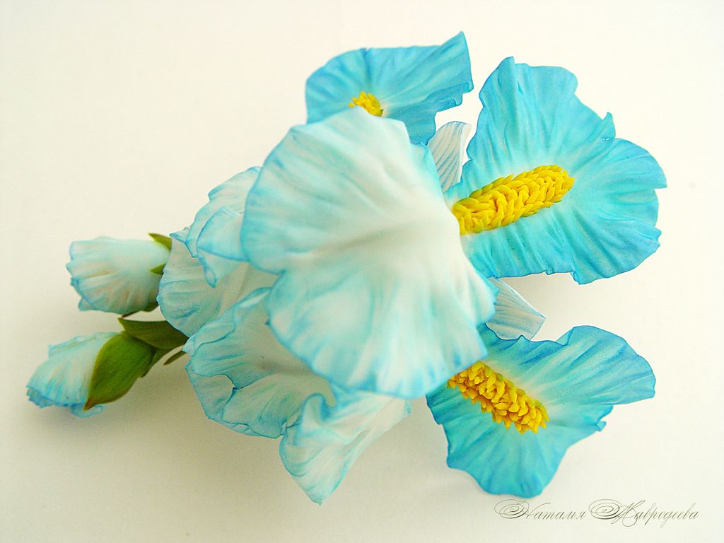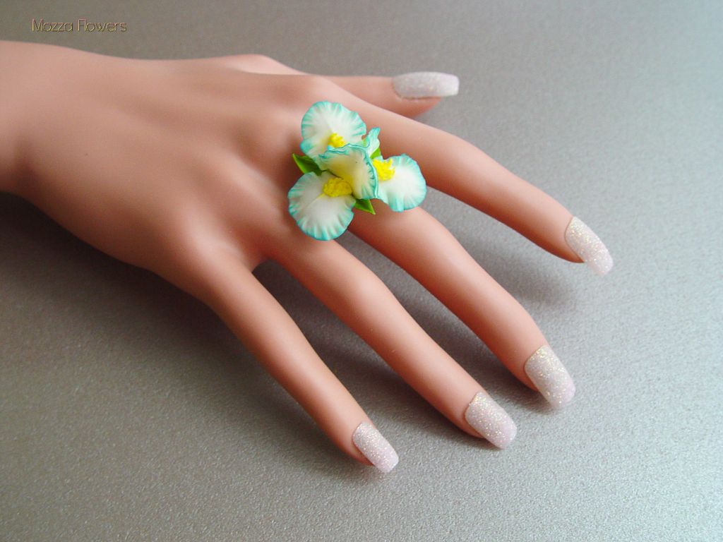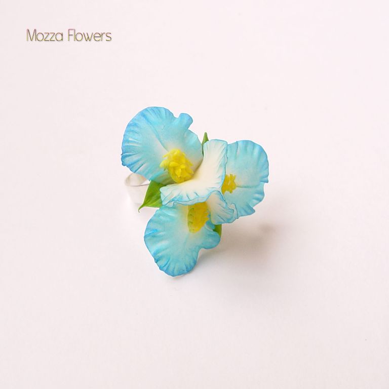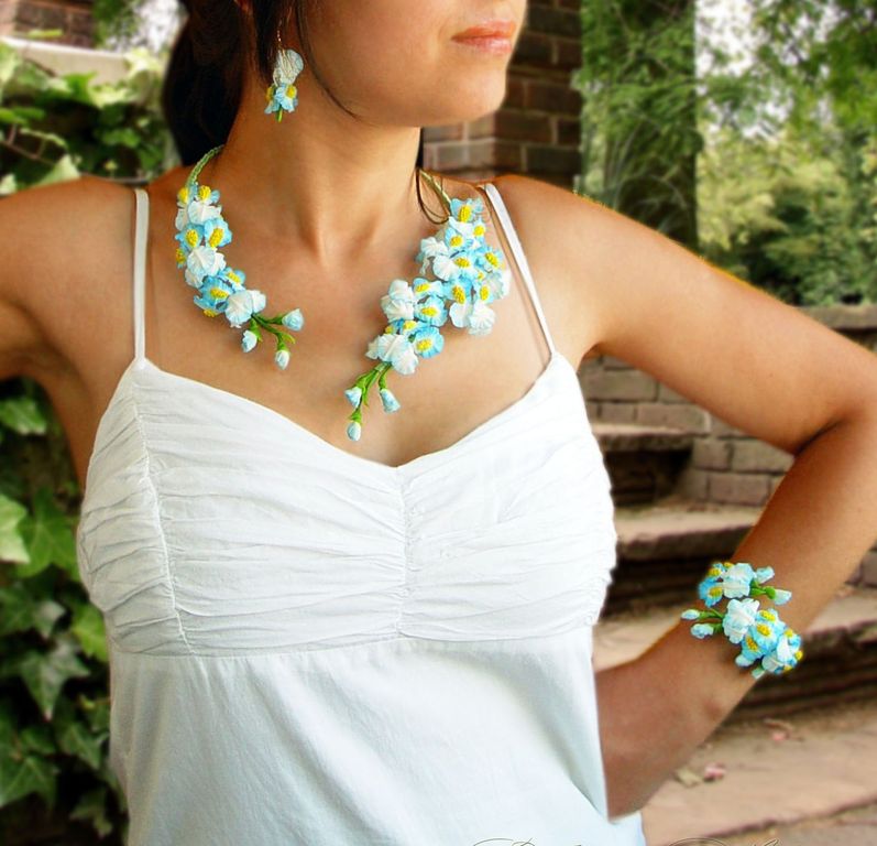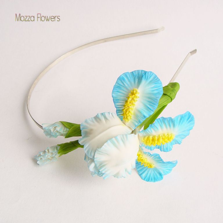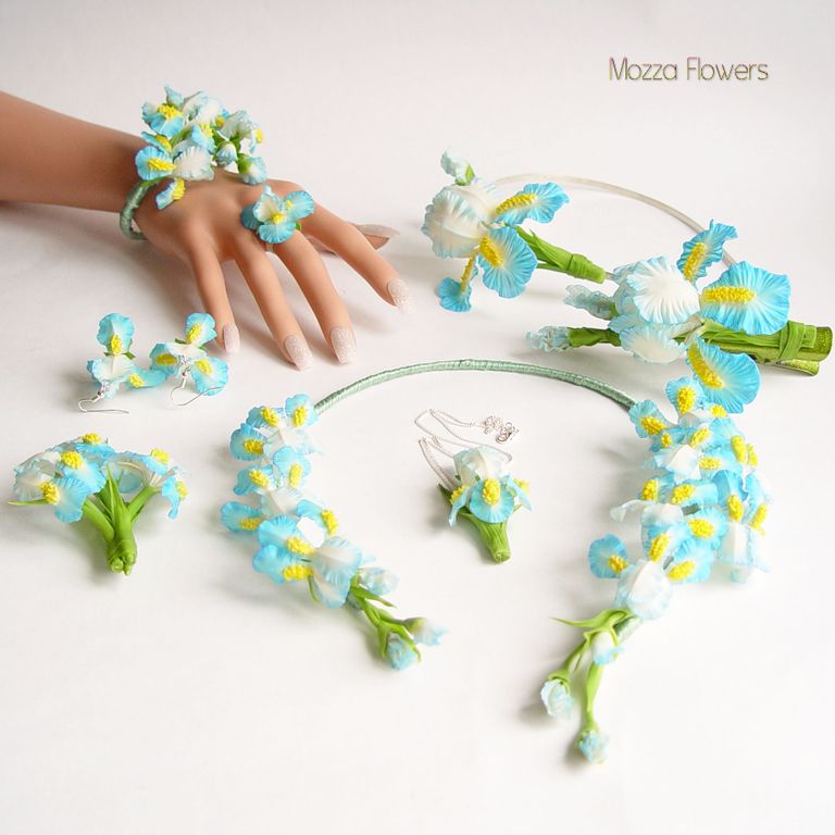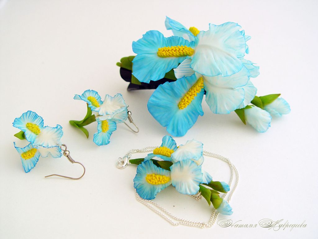Комплект украшений с голубыми ирисами "Море грез" слеплен полностью вручную из полимерной глины типа "холодный фарфор" , расписан маслом.