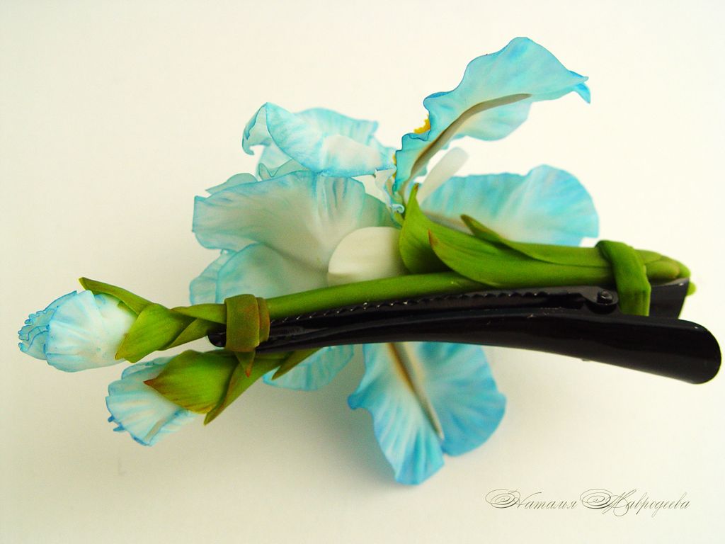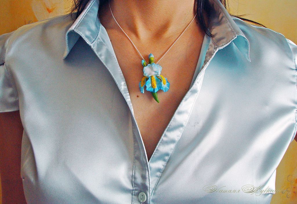 Все украшения с голубыми ирисами можно заказать по отдельности колье, серьги, браслет, брошь, кулон, ободок или заколку с голубыми ирисами.