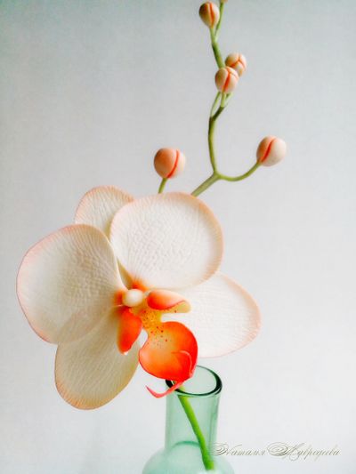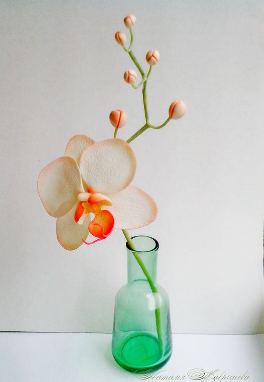 Ветка орхидеи в нежно-оранжевых тонах выполнена из полимерной глины и тонирована масляными красками полностью вручную.