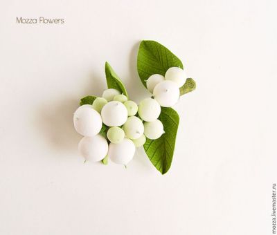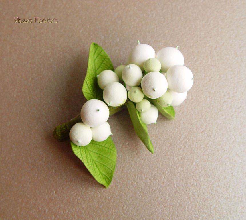 Нежные ягоды снежноягодника в маленькой брошке выполнены из очень легкой глины.