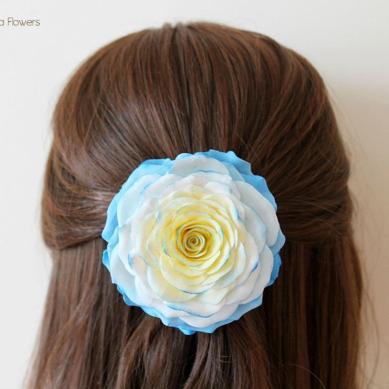 Цветок очень легкий, несмотря на то, что достаточно крупный. Можно носить как брошь, а можно носить как зажим для волос , т.к. имеет универсальное крепление.