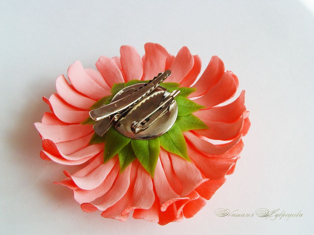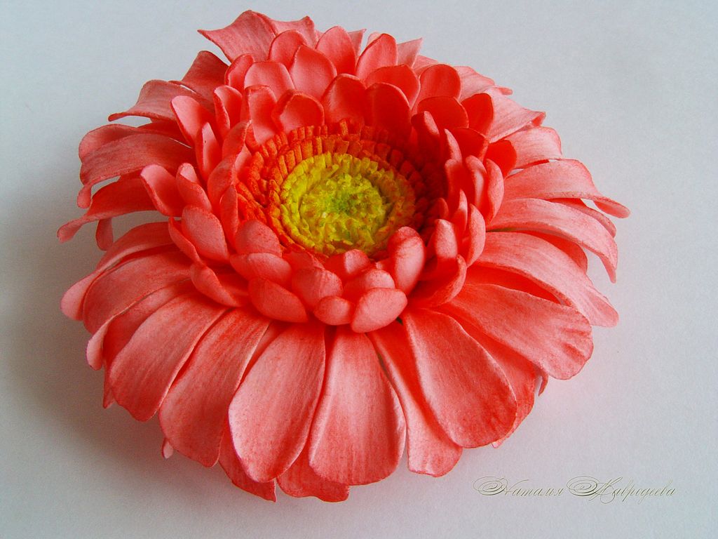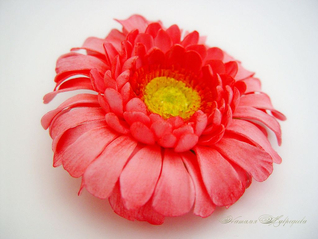 "Большая розовая гербера" вылеплена из полимерной глины двух видов и тонирована красками полностью вручную лепесток за лепестком.