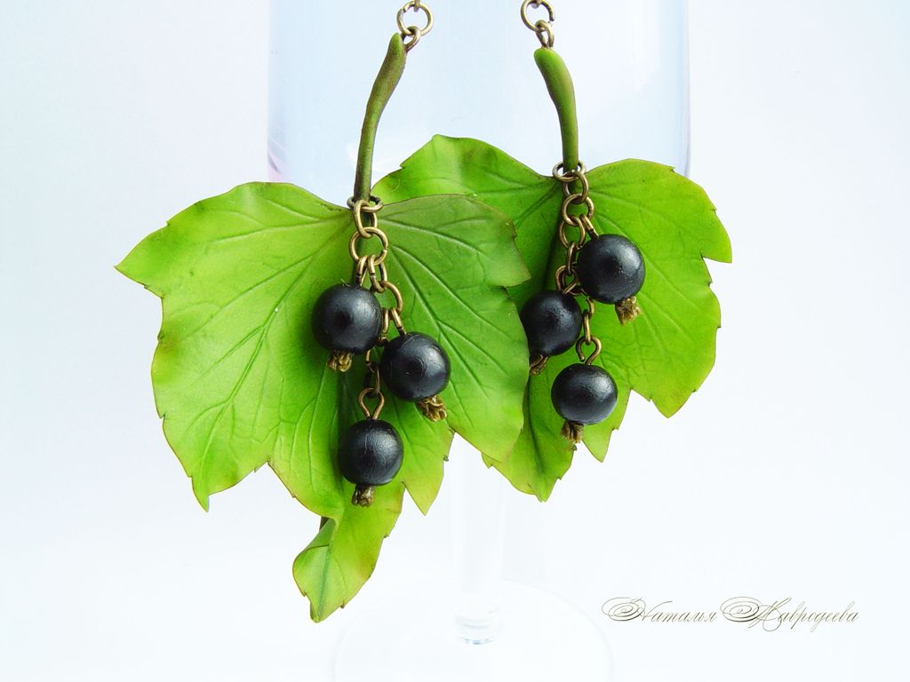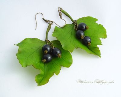 Серьги "С черной смородиной " выполнены в технике холодный фарфор, вылеплены полностью вручную из специальной полимерной глины и тонированы маслом.