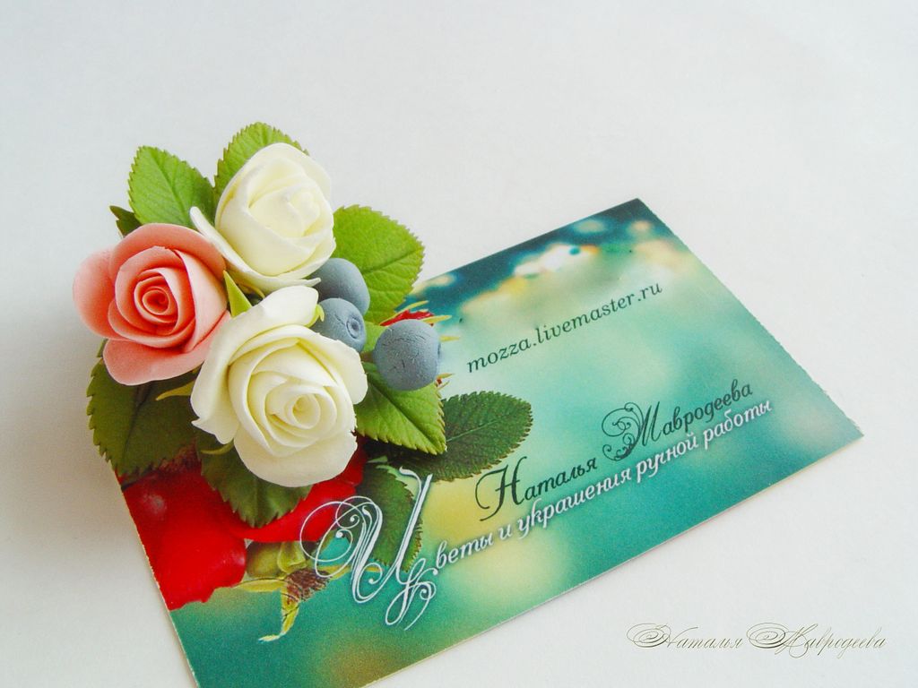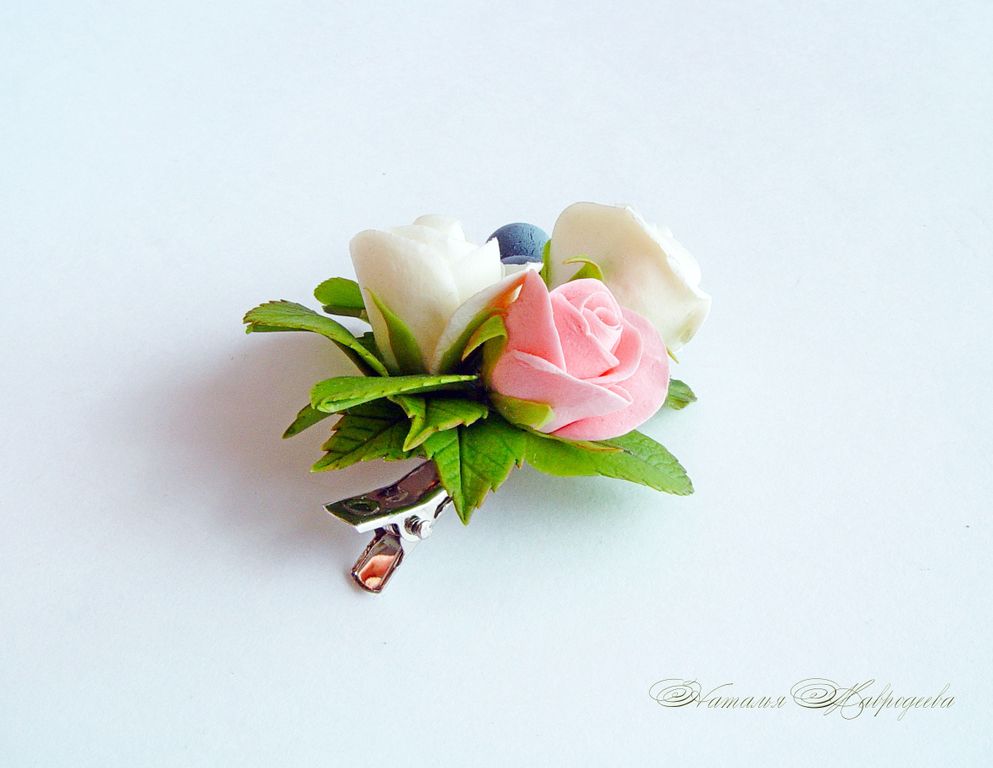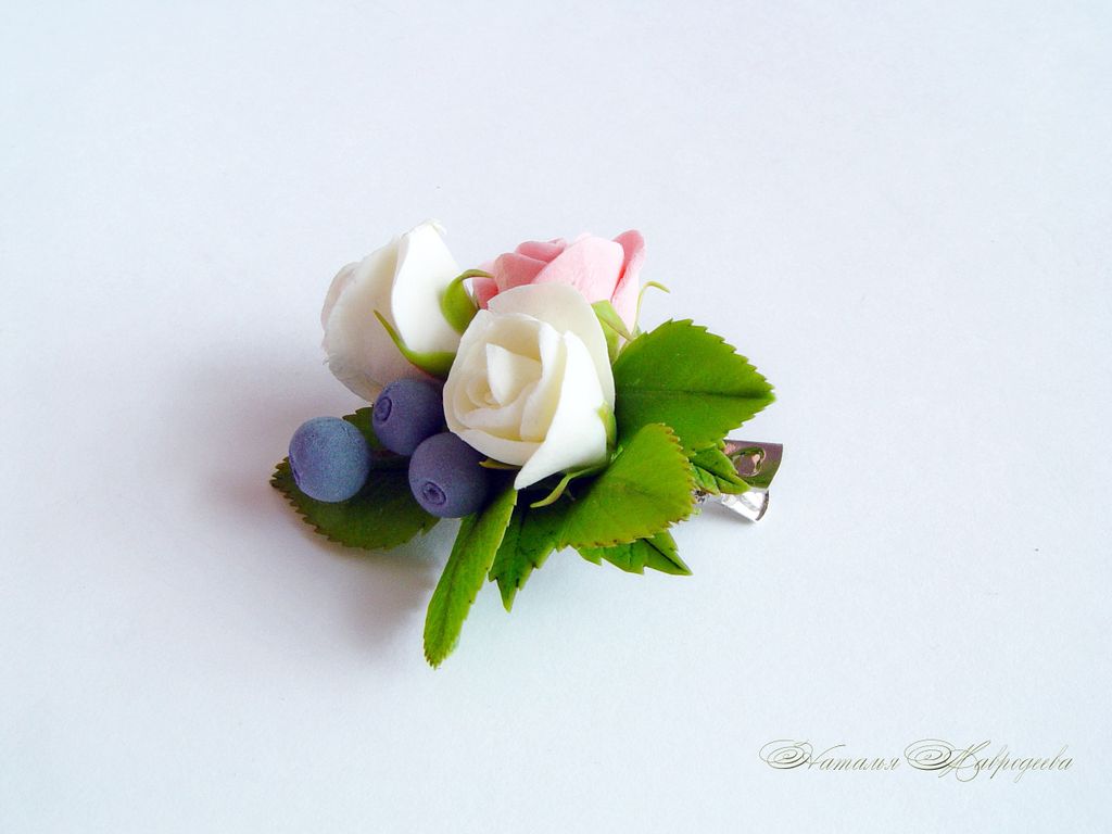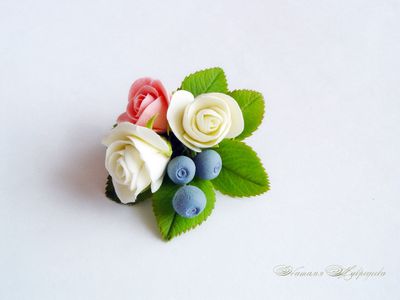 "Розочки с голубикой" вылеплены из двух видов полимерной глины и тонированы красками полностью вручную лепесток за лепестком.