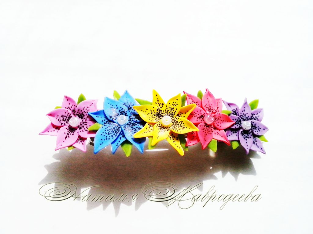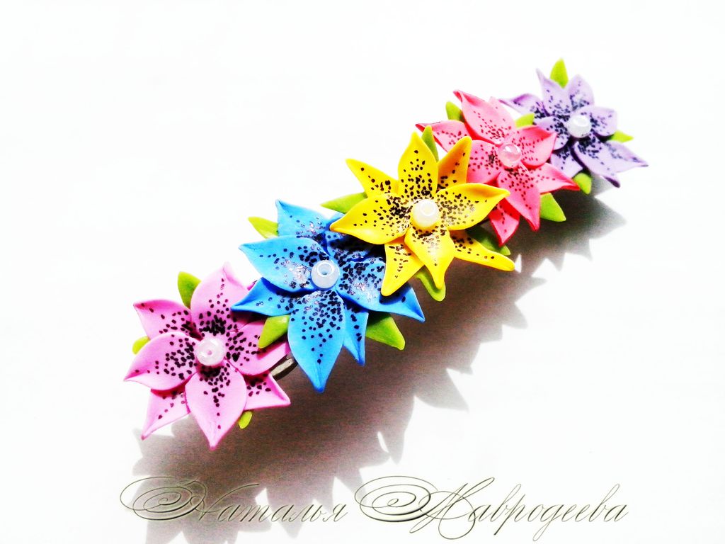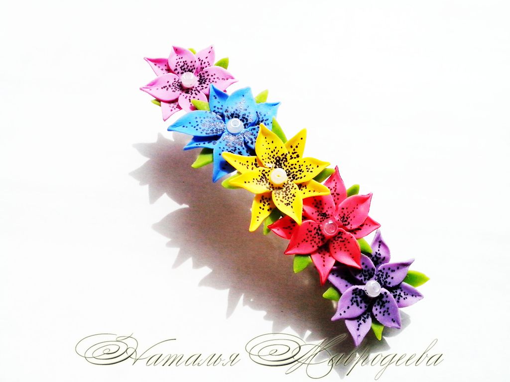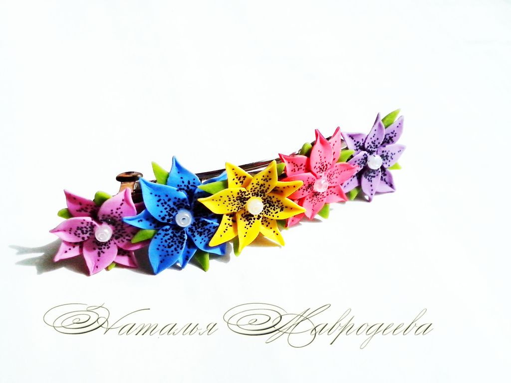 Заколка выполнена из полимерной глины и тонирована масляными красками вручную.