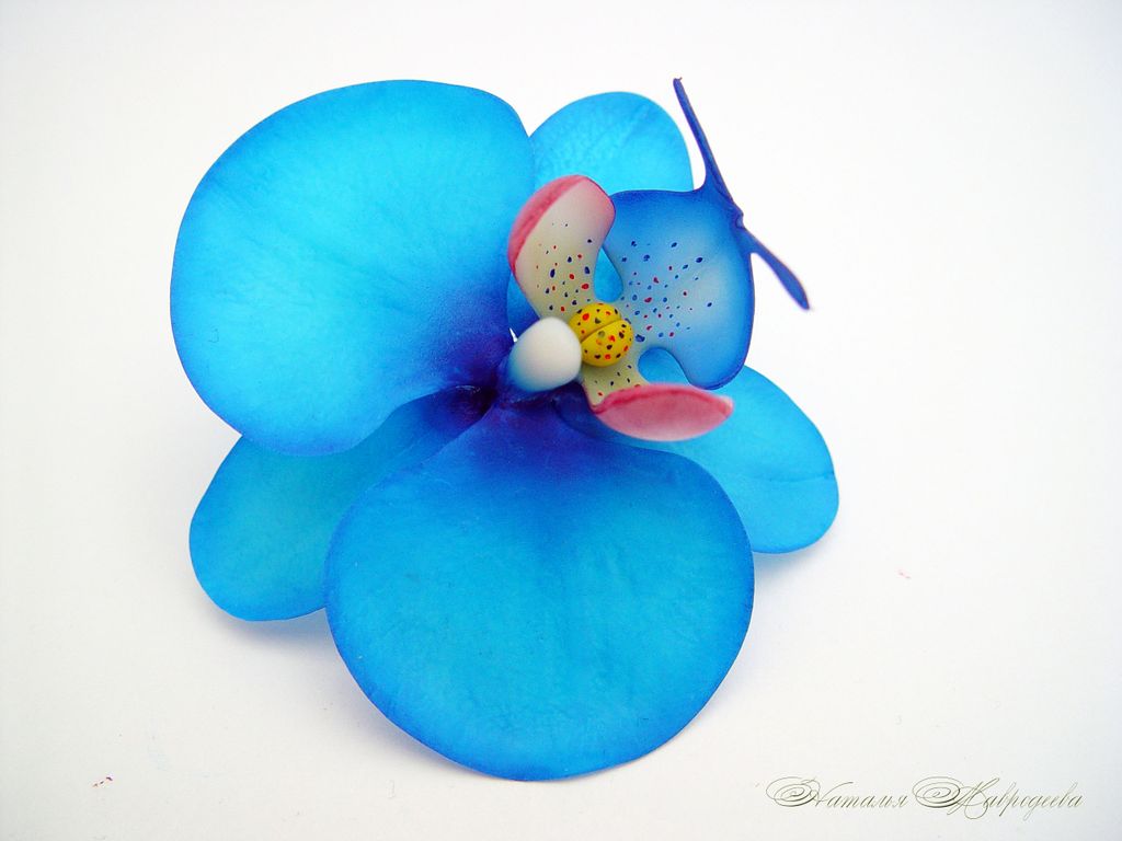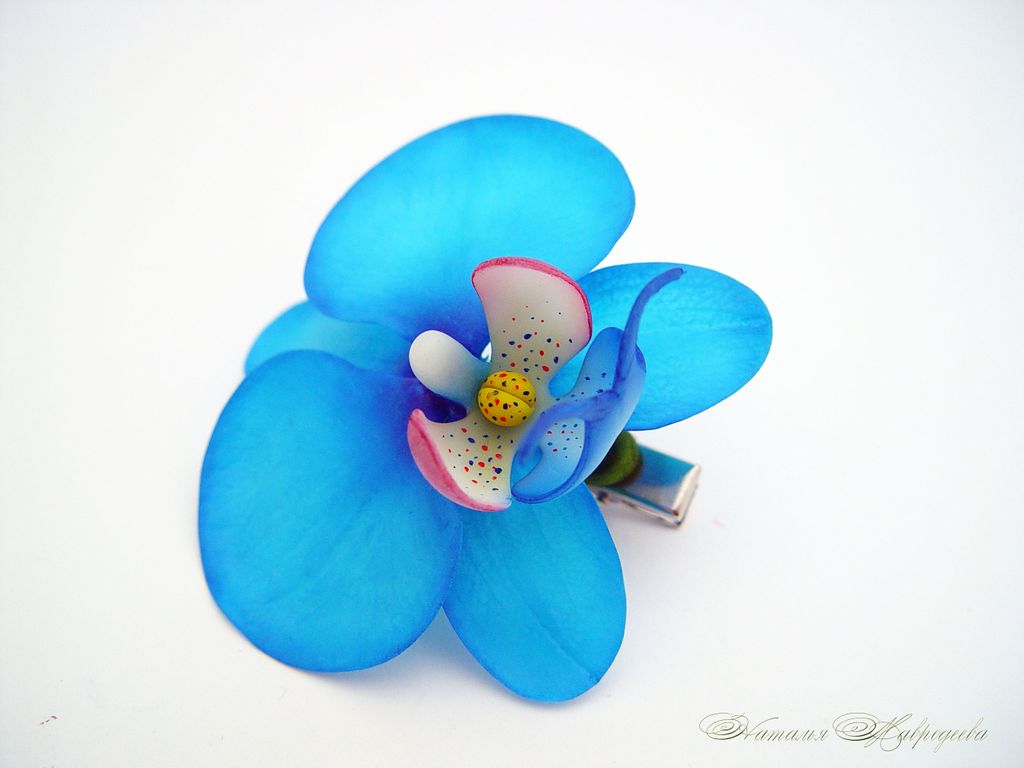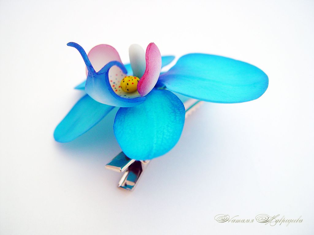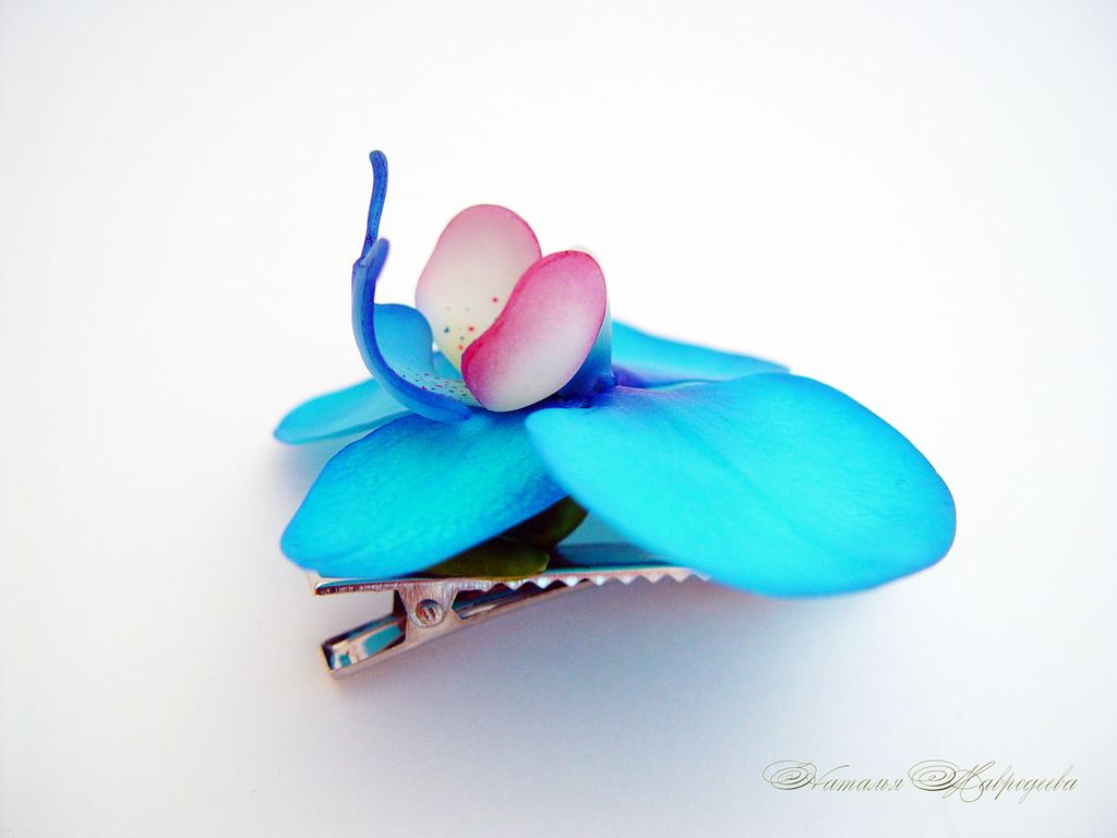 Зажим для волос с орхидеей "Синяя бездна" выполнен из полимерной глины и тонирован вручную.