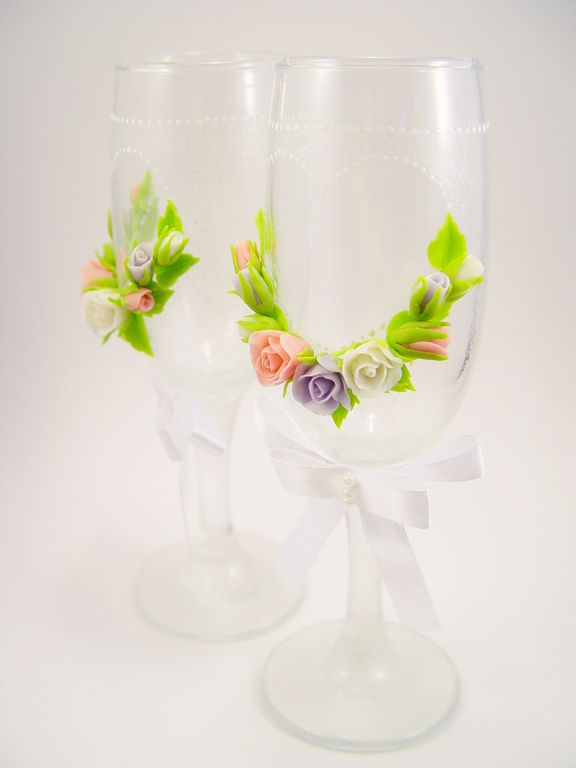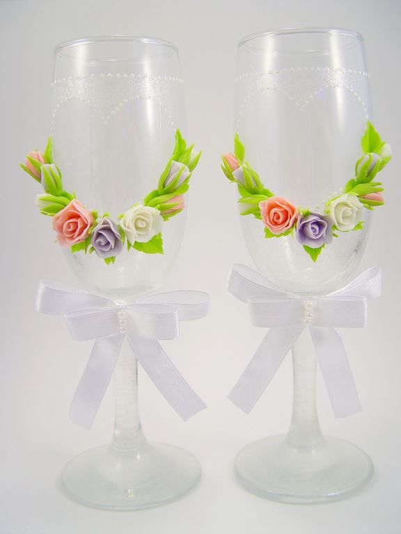 Свадебные бокалы декорированы вручную. Цветы на бокалах слеплены вручную из полимерной глины, Роспись белым акрилом и перламутровым лаком.