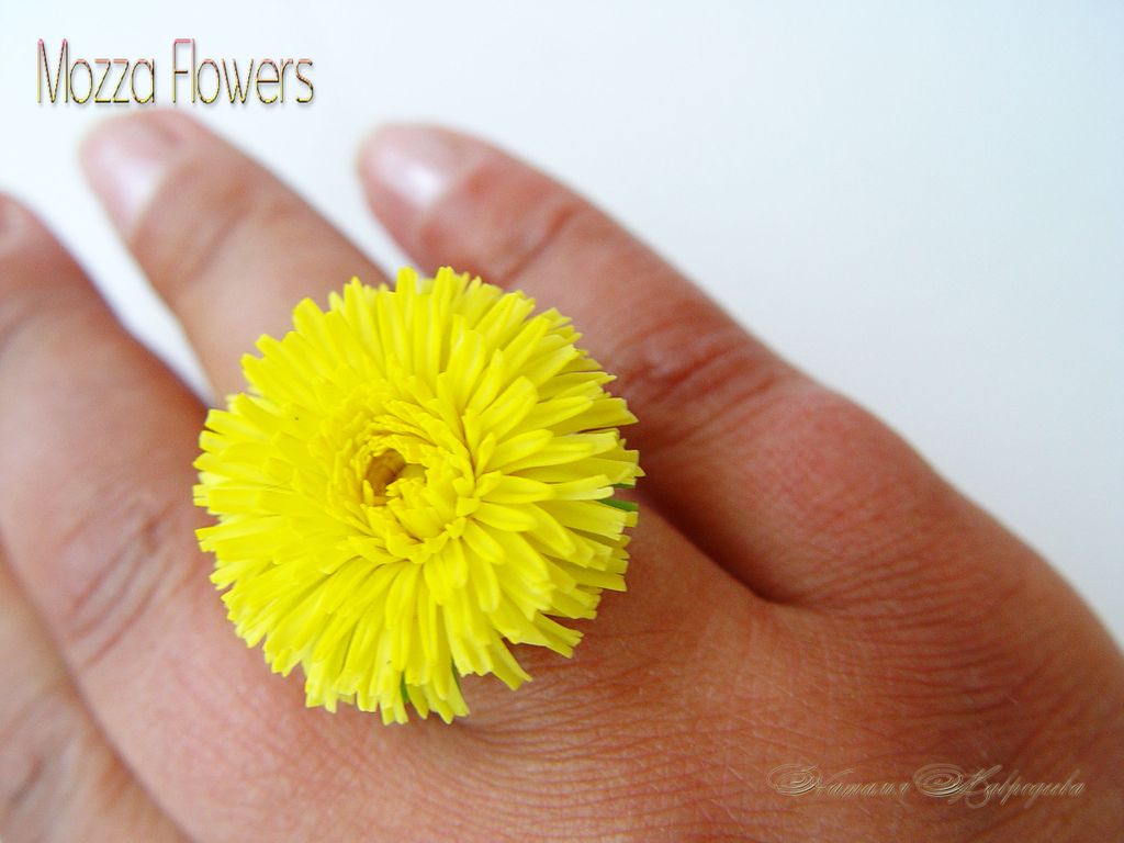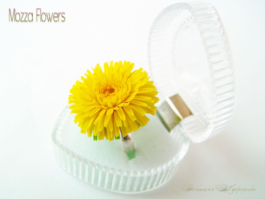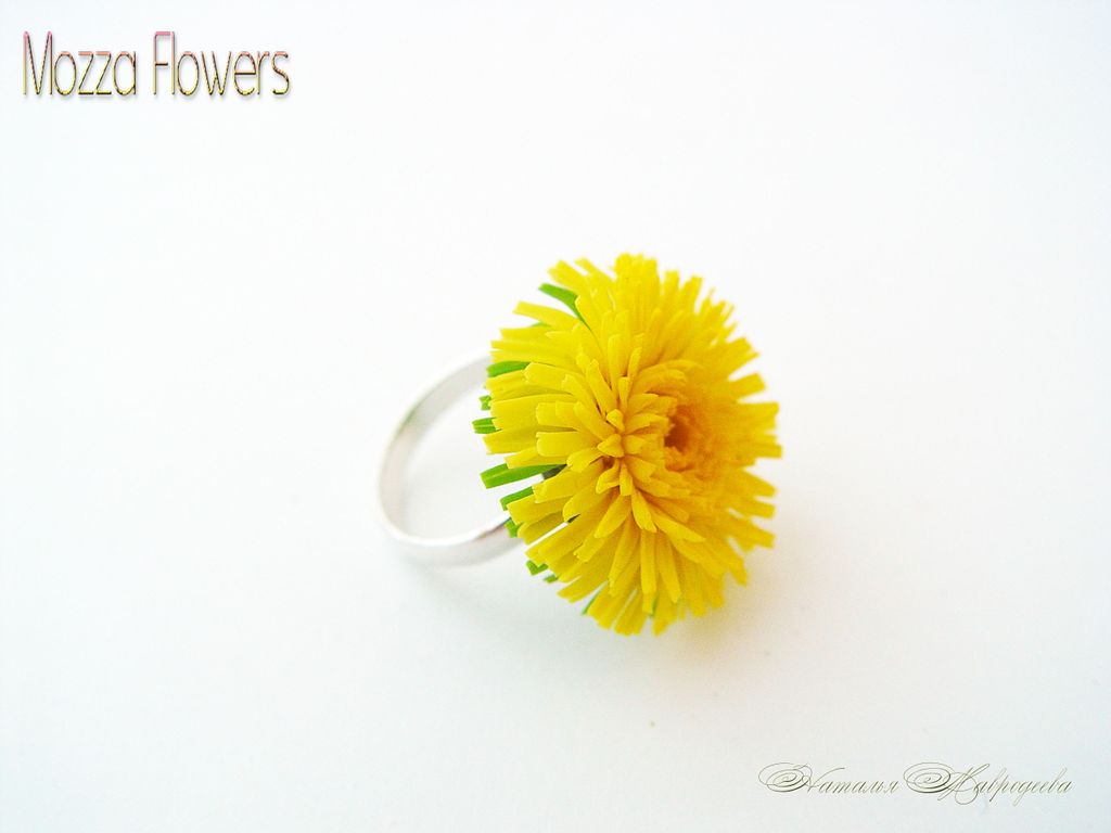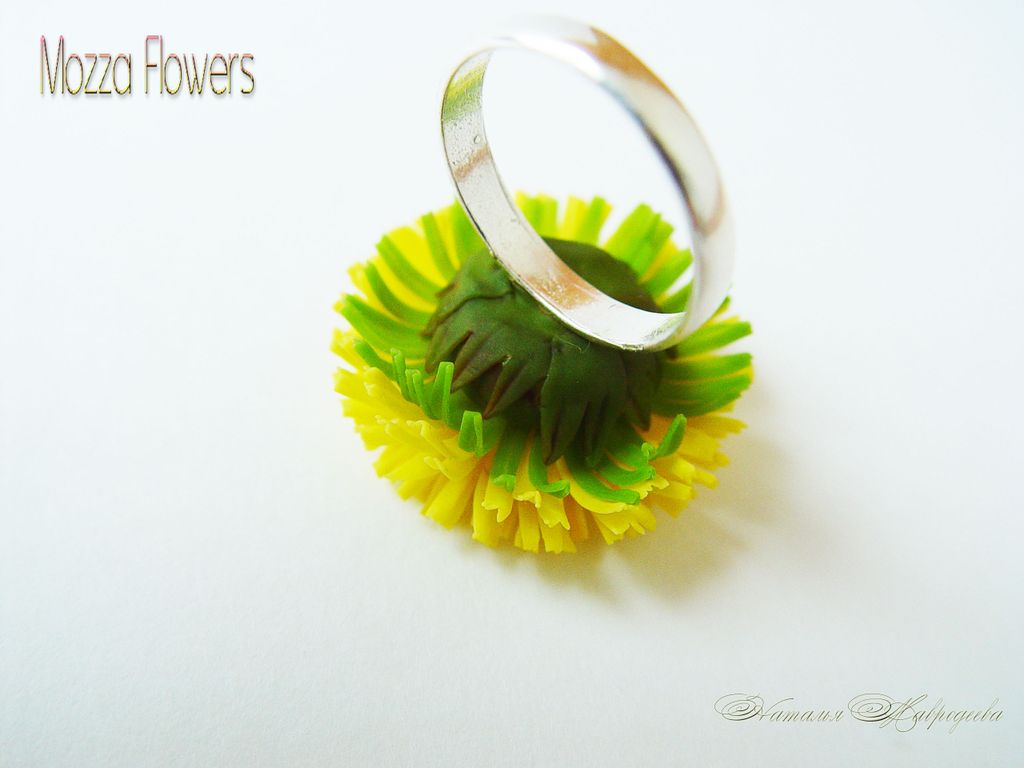 Кольцо с одуванчиком выполнено из полимерной глины и тонировано масляными красками полностью вручную.