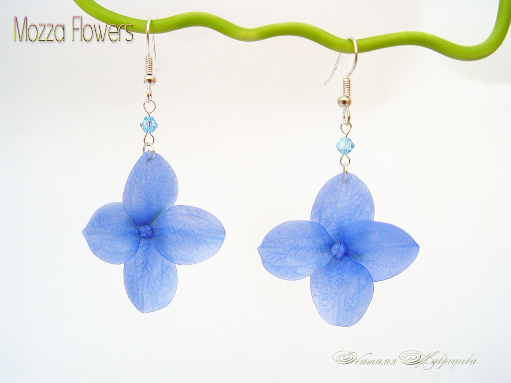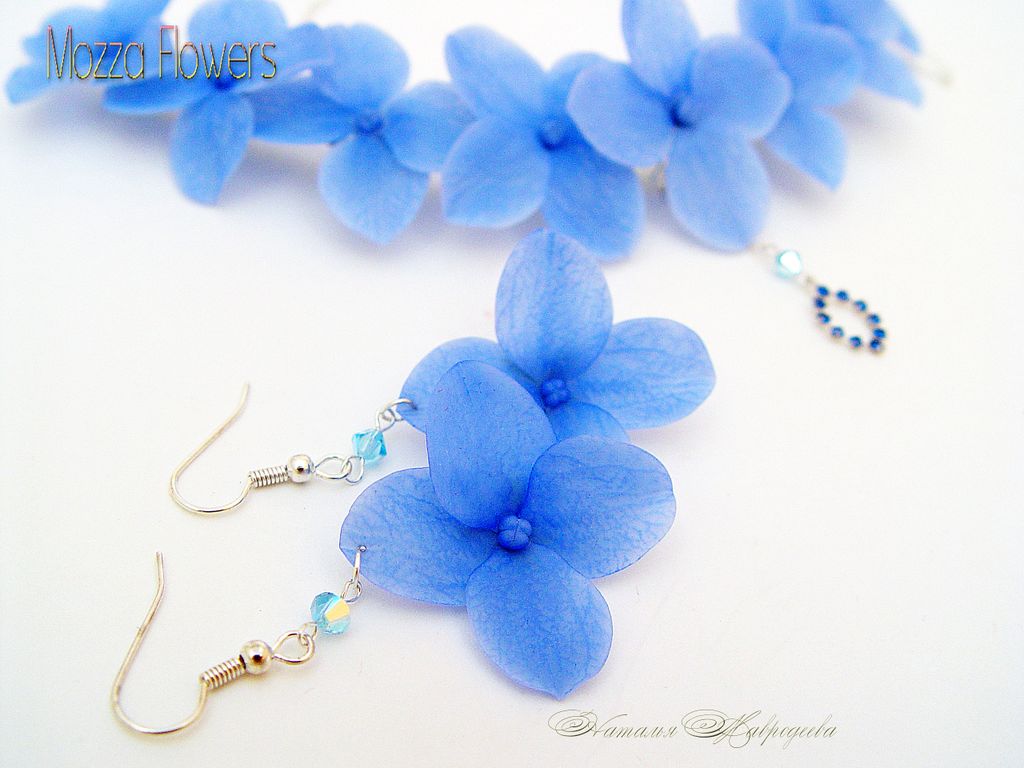 Нежнейшие полупрозрачные лепестки гортензии, кристаллы Swarovski , искрящиеся и переливающиеся на солнце, изящная посеребренная фурнитура - создадут неповторимый летний образ.