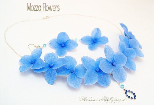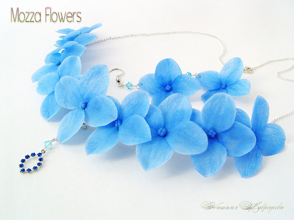 Комплект "Голубая гортензия" слеплен из полимерной глины (холодныйфарфор) и тонирован масляными красками лепесток за лепестком полностью вручную.