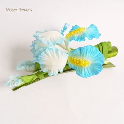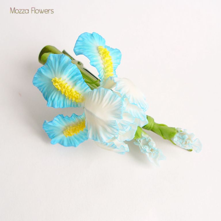 Ирисы выполнены из японской глины и тонированы красками полностью вручную, слеплены лепесток за лепесточком, листок за листочком.
