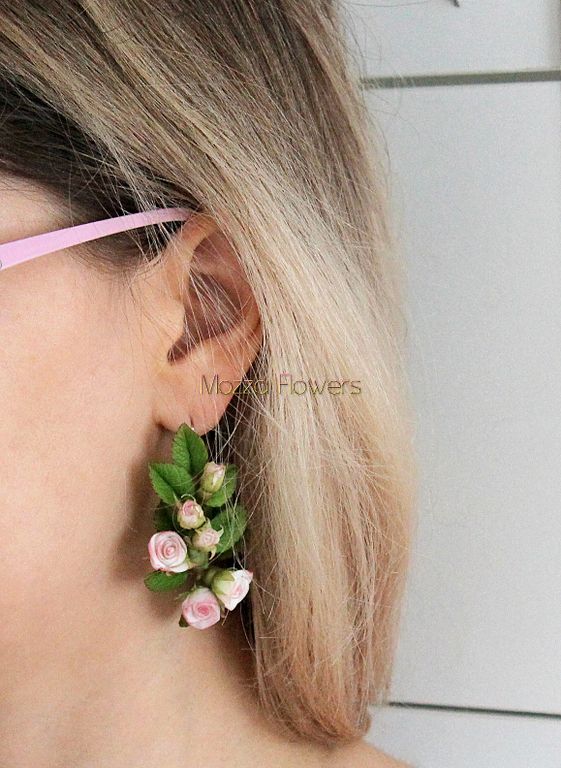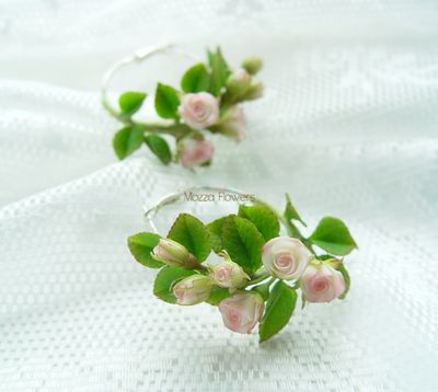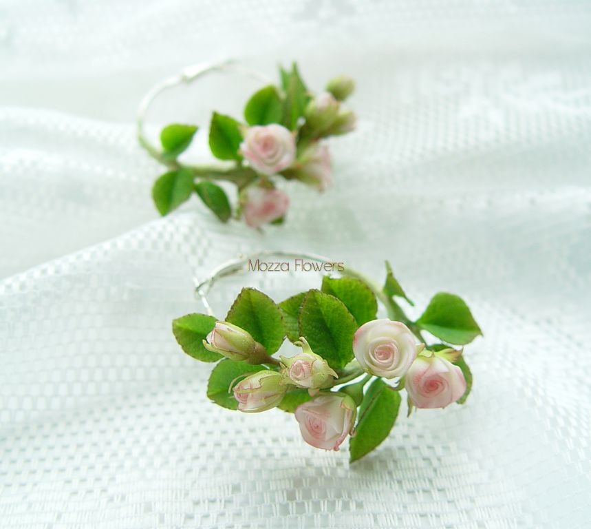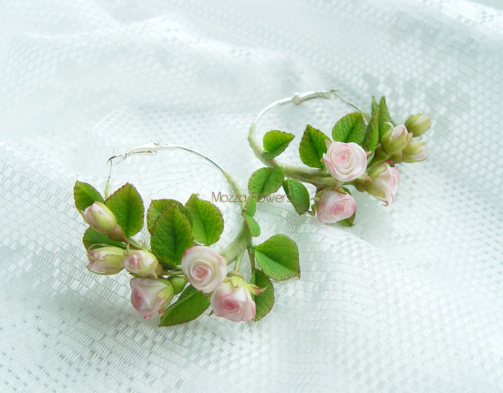 Серьги-кольца с миниатюрными розочками слеплены полностью вручную из полимерной глины .