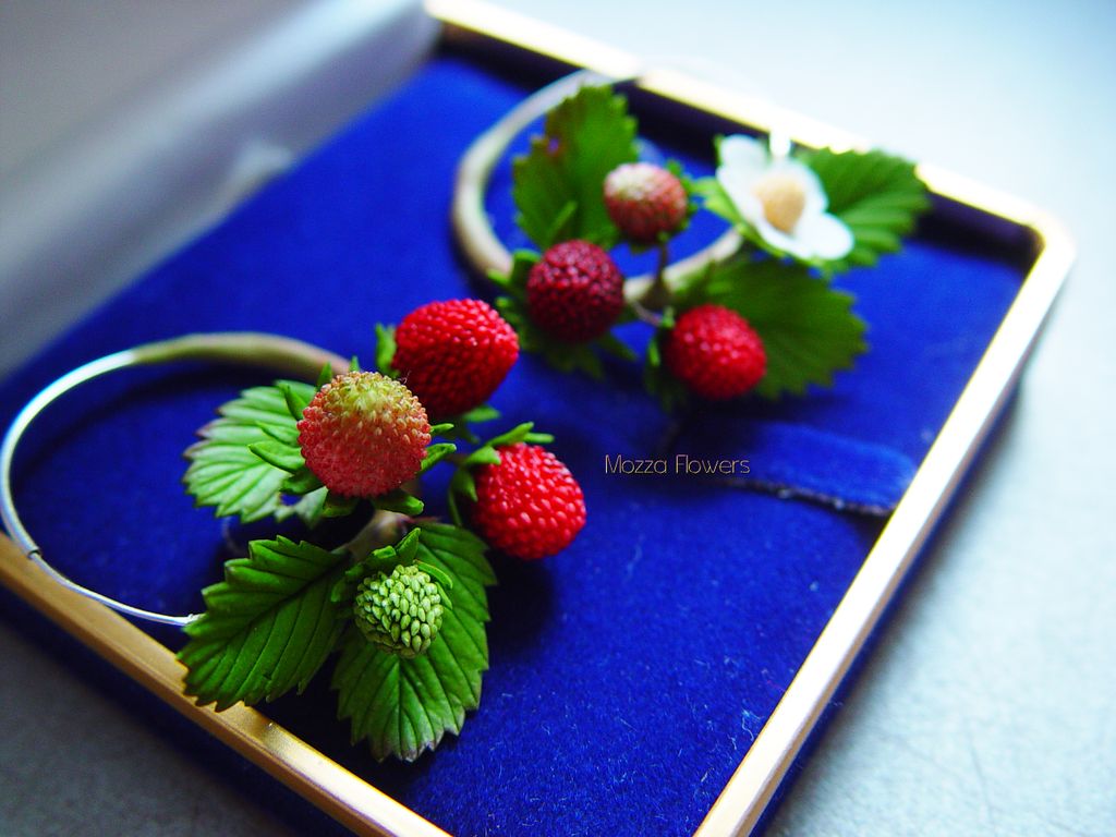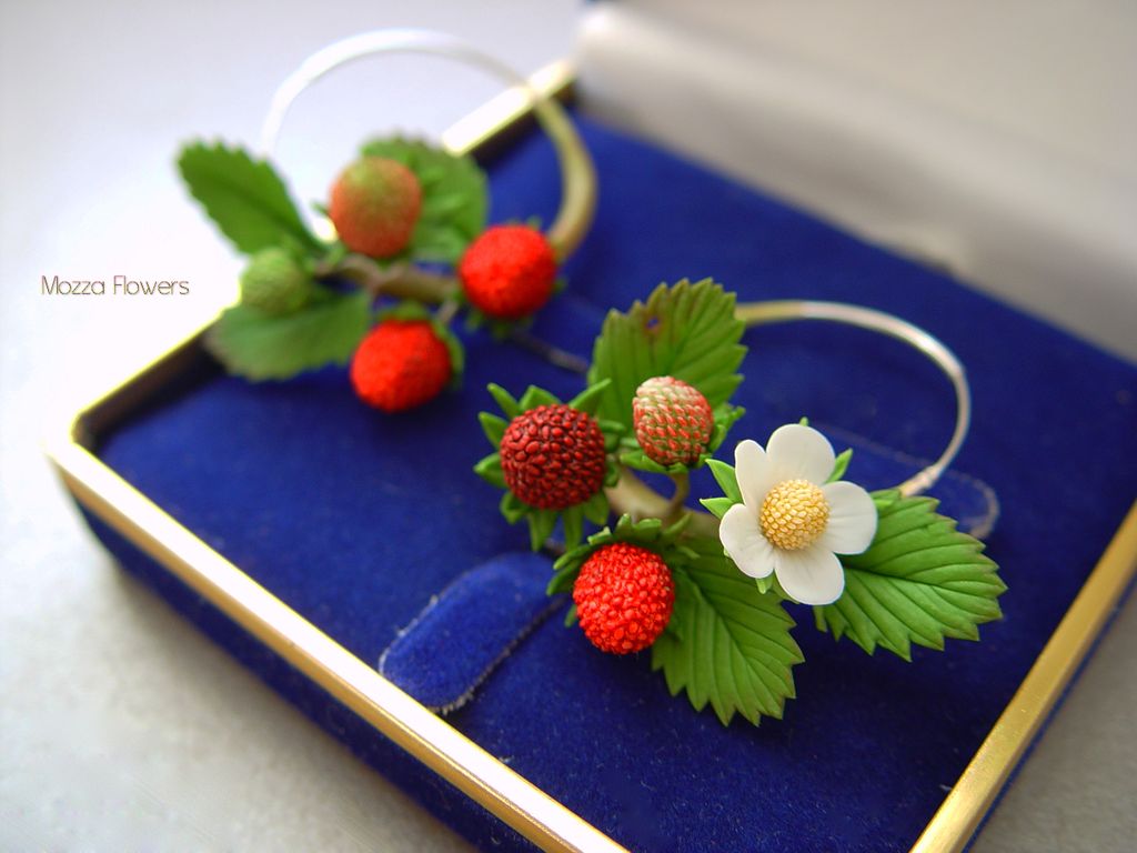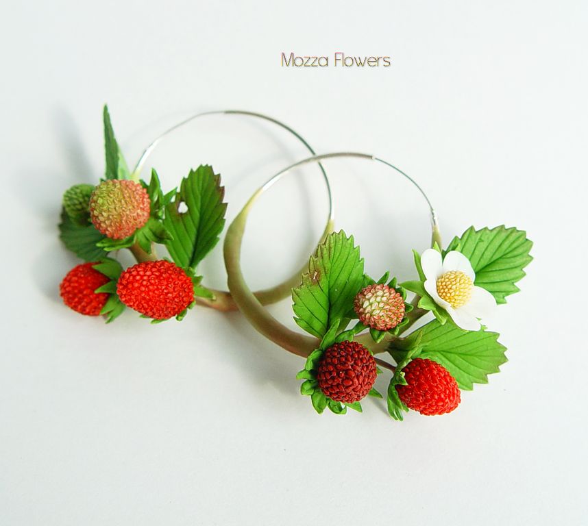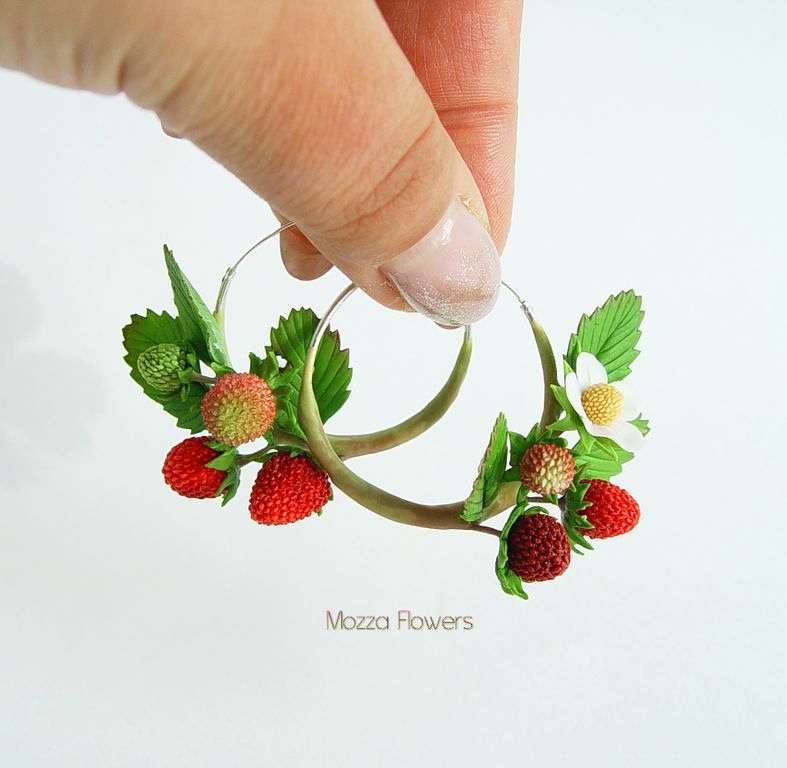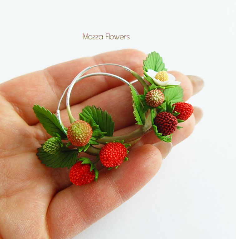 Серьги-кольца с земляникой выполнены полностью вручную, слеплены из полимерной глины и вручную тонированы масляными красками.