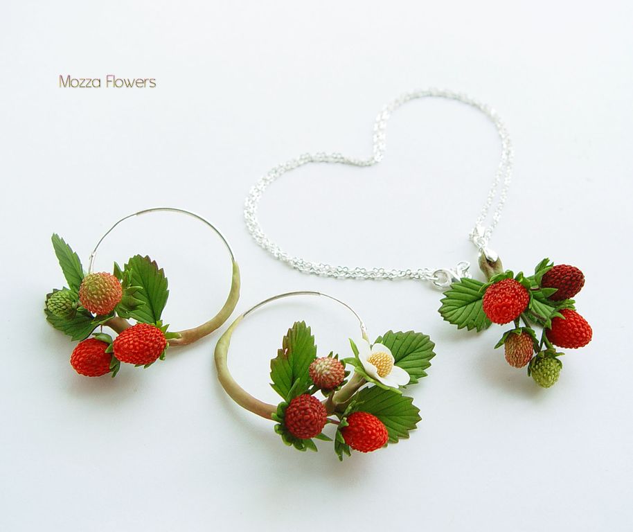 Комплект украшений с земляникой слеплен вручную из полимерной глины , тонирован масляными красками.