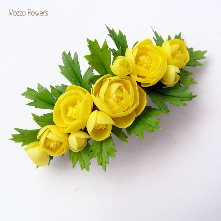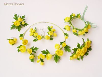 Комплект украшений с купавками выполнен полностью вручную, слеплен из полимерной глины и тонирован масляными красками.