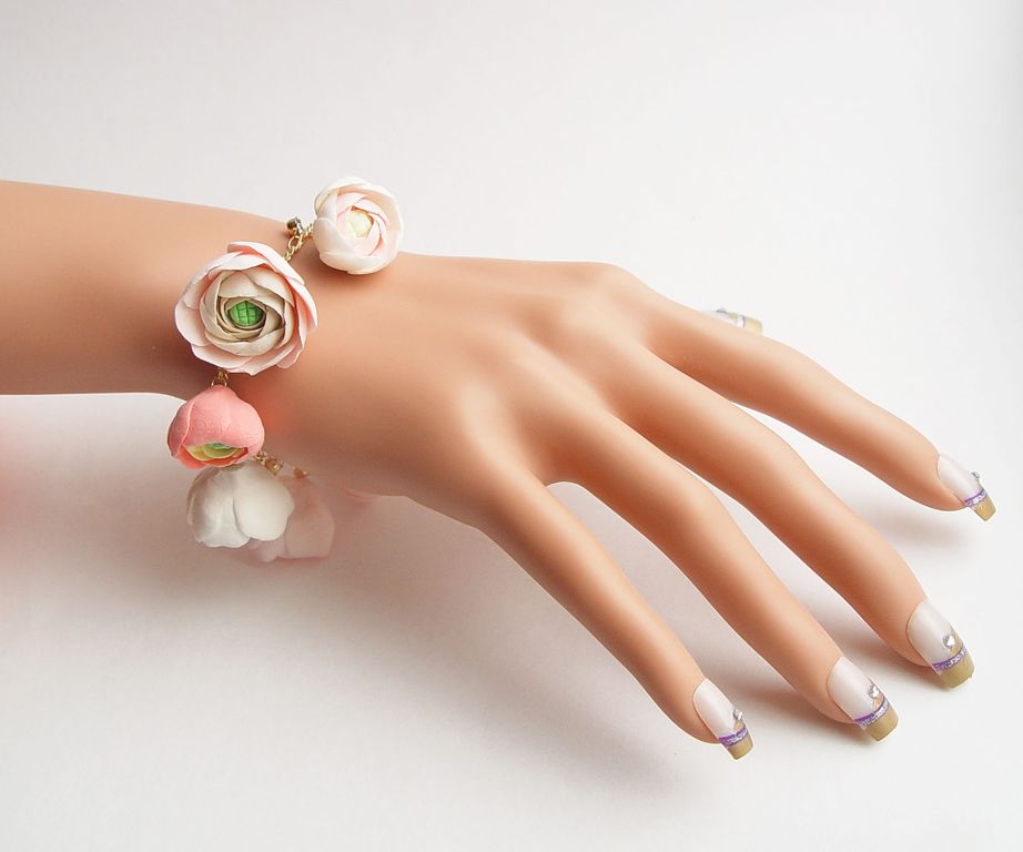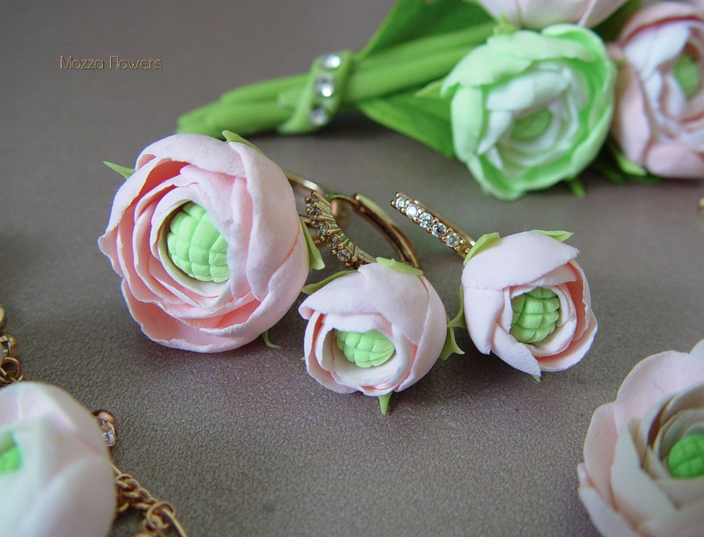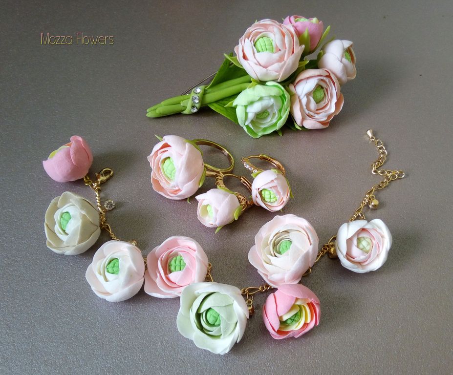 Комплект с ранункулюсами выполнен полностью вручную, слеплен из бархатной полимерной глины.